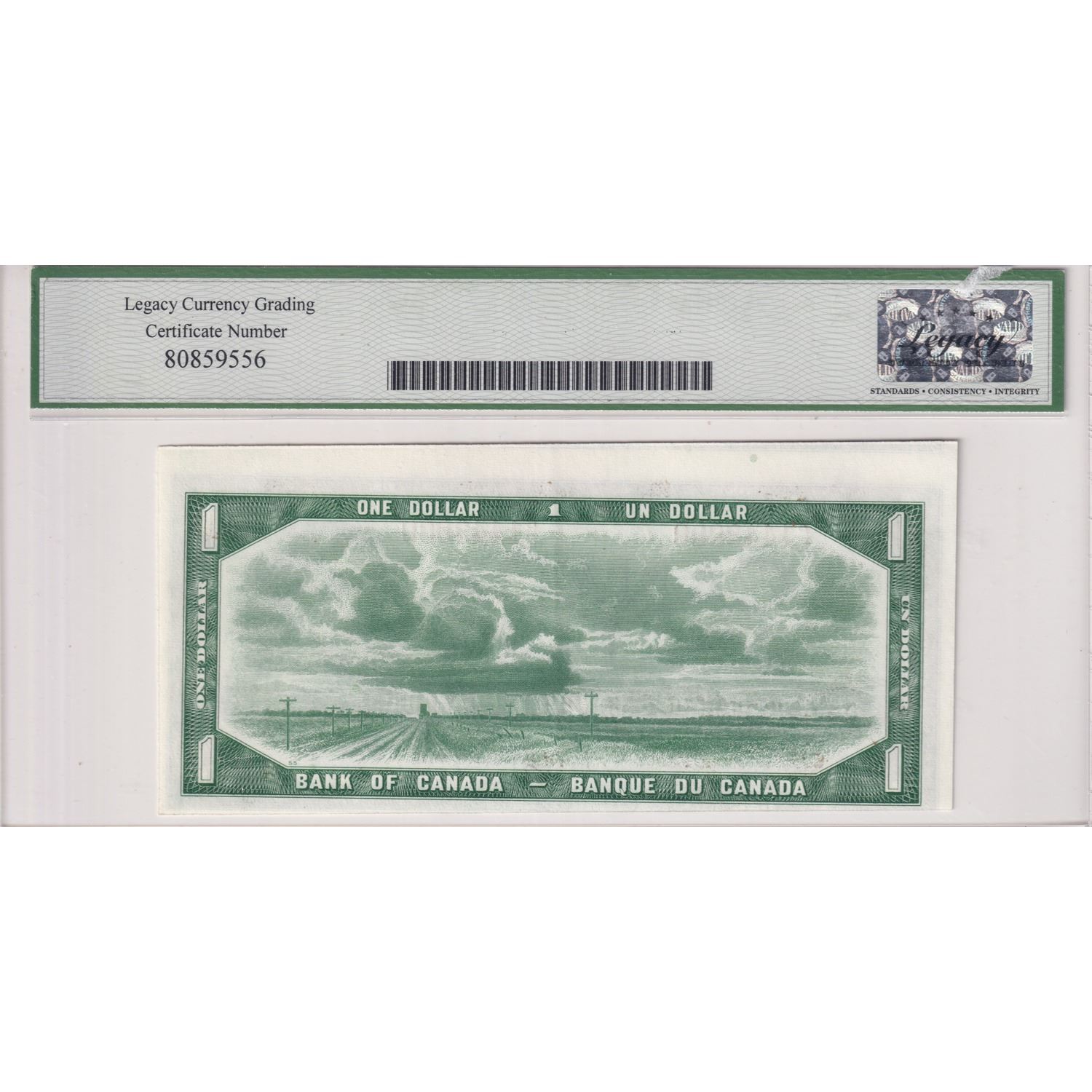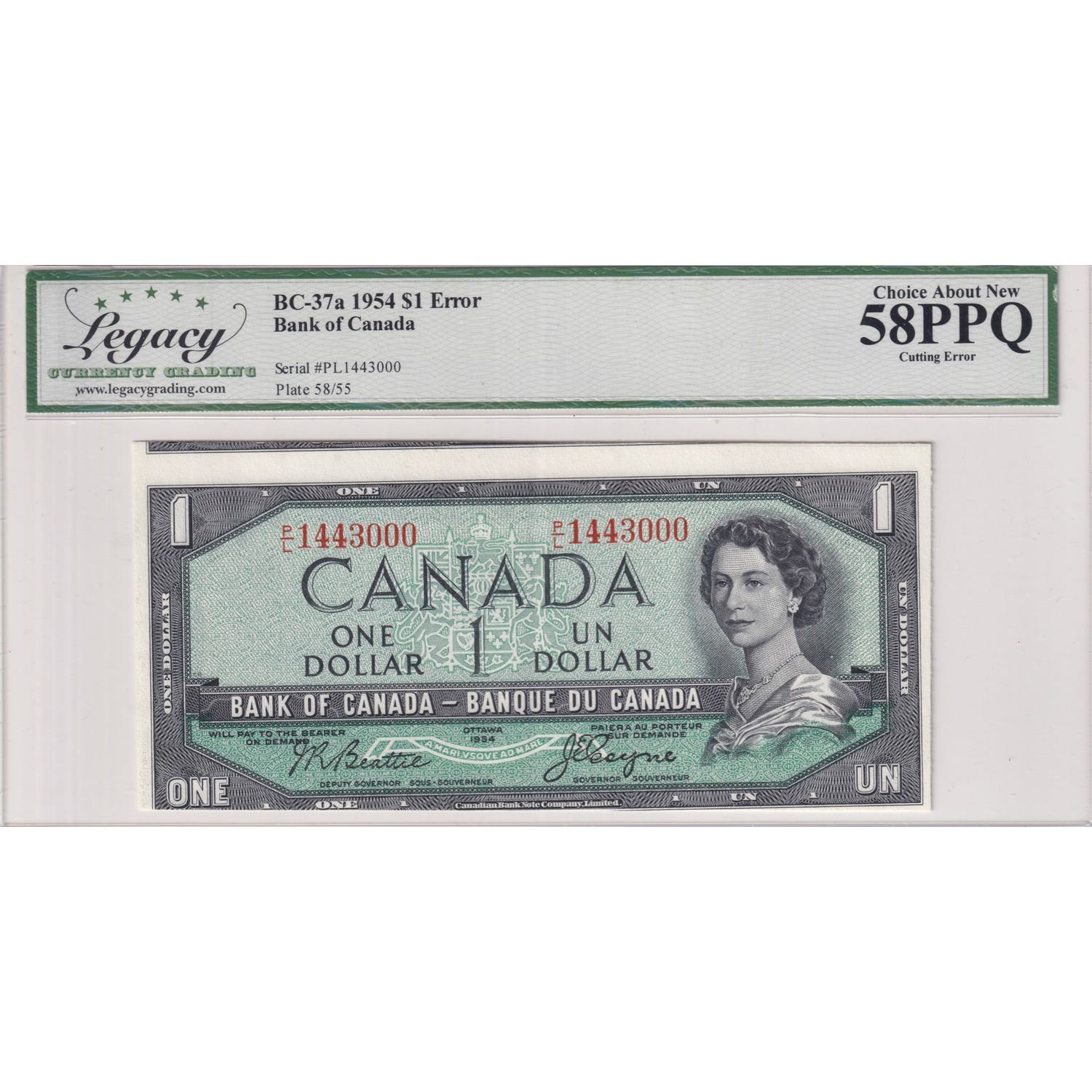 Error! 1954 BC-37a $1, Bank of Canada, Beattie-Coyne, S/N: P/L1443000, Cutting Error, Legacy Certified AU-58 PPQ.