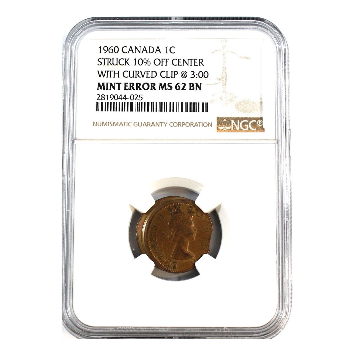 Error 1960 Canada 1-cent Struck 10% off Center with Curved Clip at 3:00. NGC Certified MS-62 BN. A Unique double error!