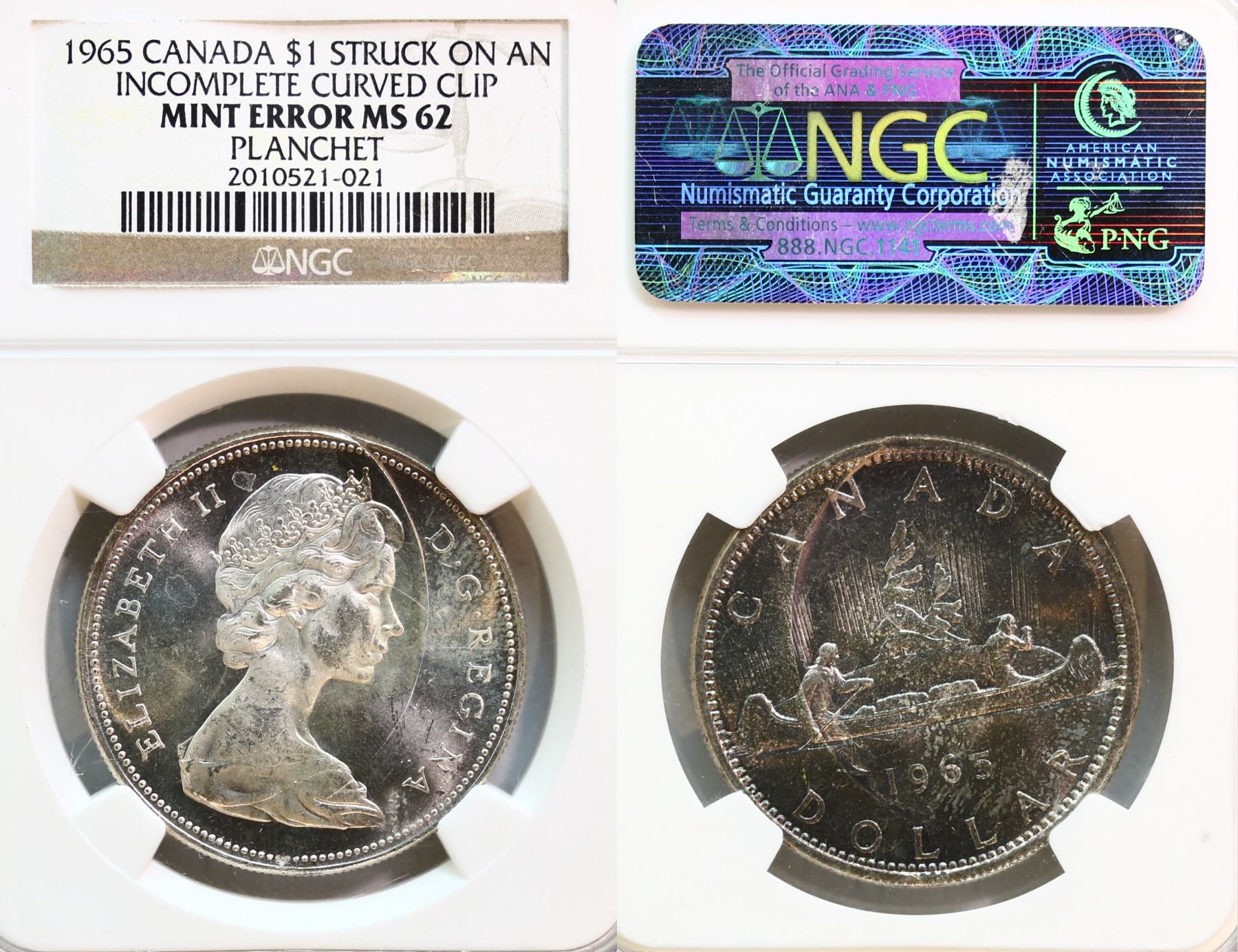 Error; 1965 $1 "Struck on an incomplete curved Clip planchet" NGC MS62