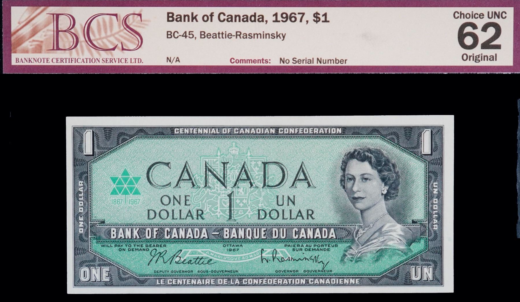 Error; 1967 $1 BC-45 BCS Choice Uncirculated-62 Original "Missing serial numbers"