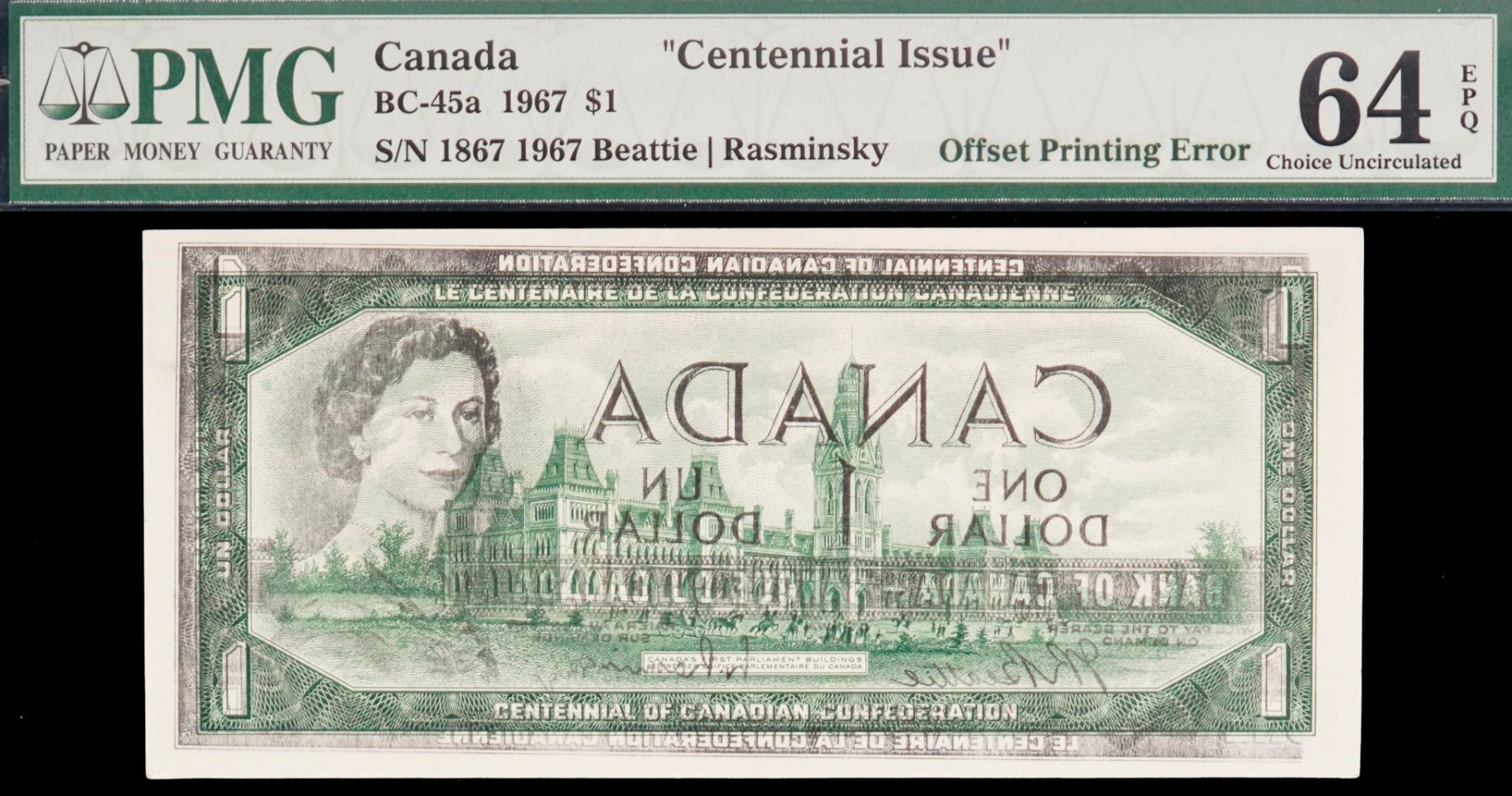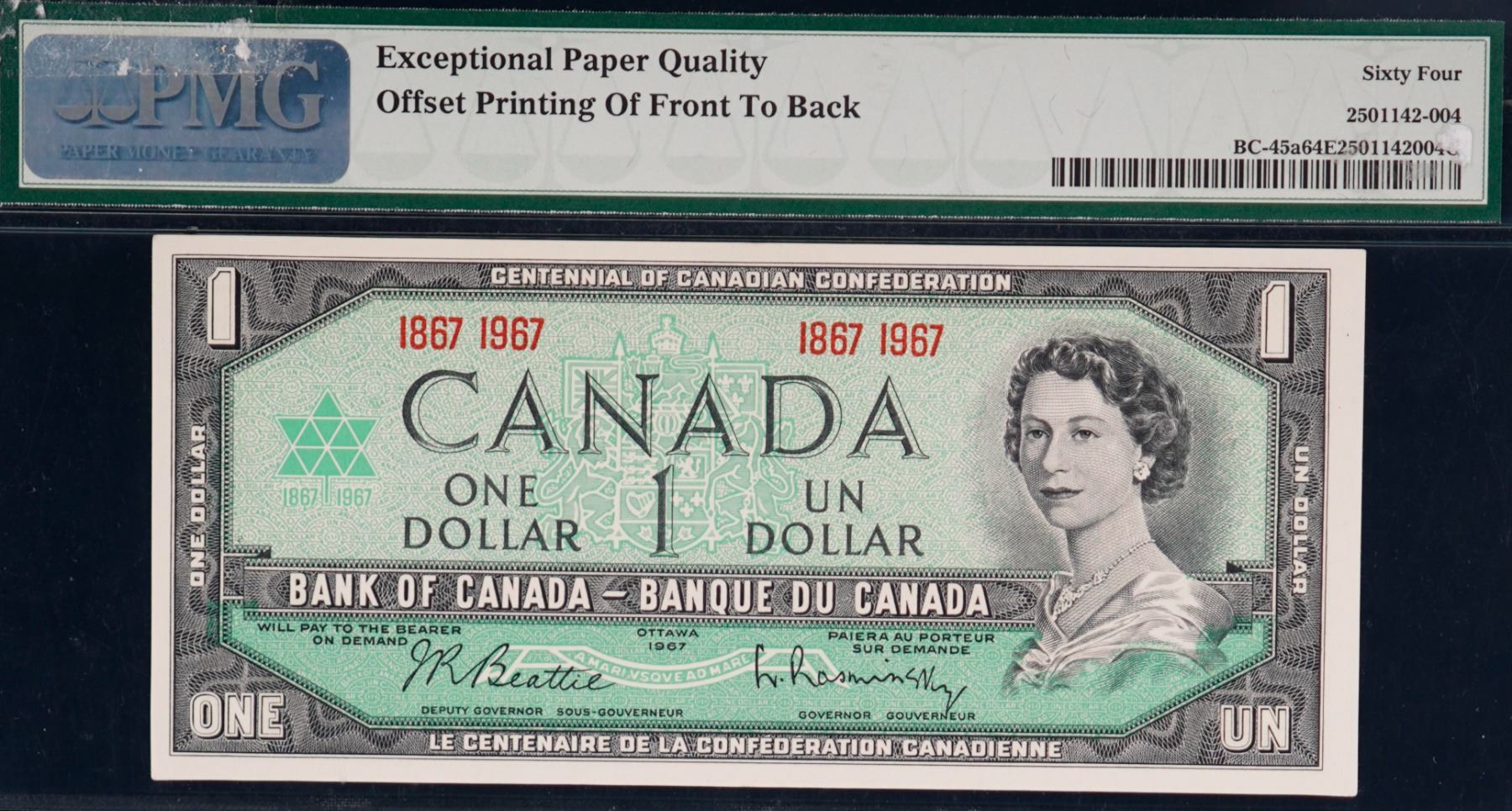 Error; 1967 $1 BC-45a PMG Choice Uncirculated-64EPQ. "Full Face to Back Offset" A major error! Worth a premium bid!