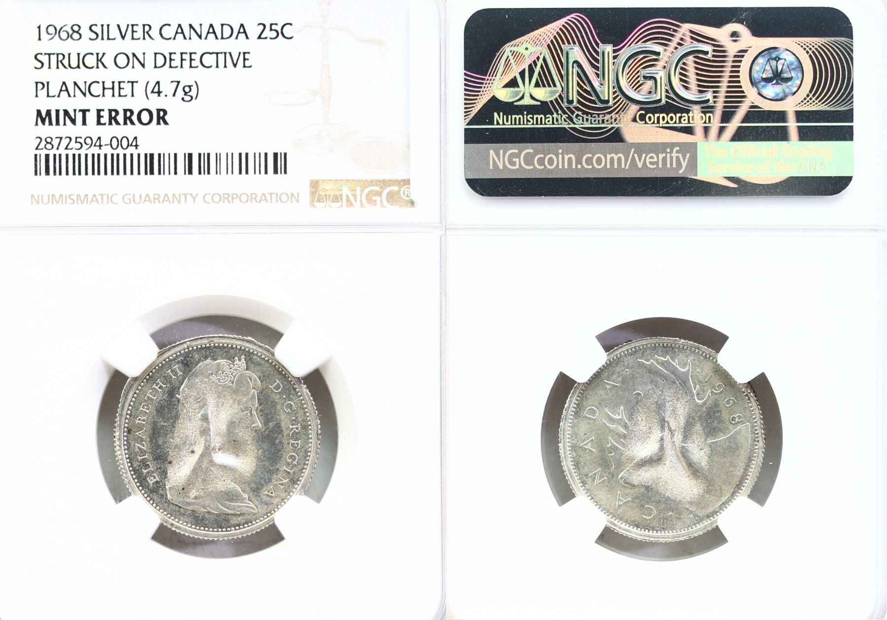Error; 1968 25¢, NGC Mint Error. Struck on Defective Planchet, weighs 4.7 grs.