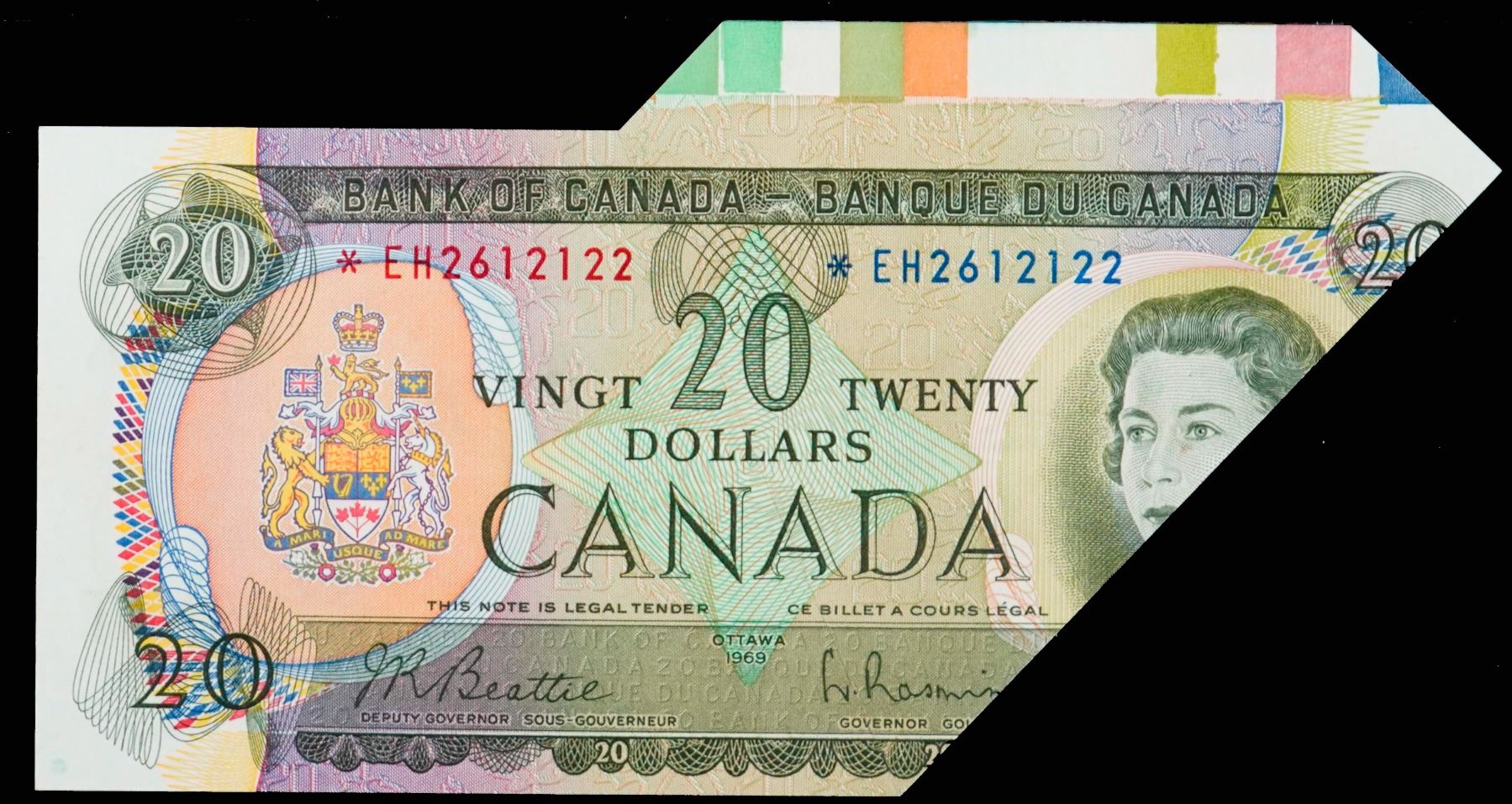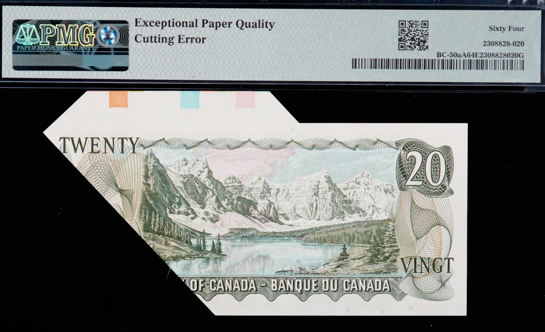Error; 1969 $20 BC-50aA #*EH2612122, PMG Choice Uncirculated-64PPQ. Fold/cutting error with salvage on a Replacement note. A spectacular example! IMPORTANT NOTE; This note corresponds as being the top note as well as the note above the same type Error example sold as Lot #552 in the Prominence IV sale for $15,470. A quite unique discovery and first time this has been seen by TCNC.