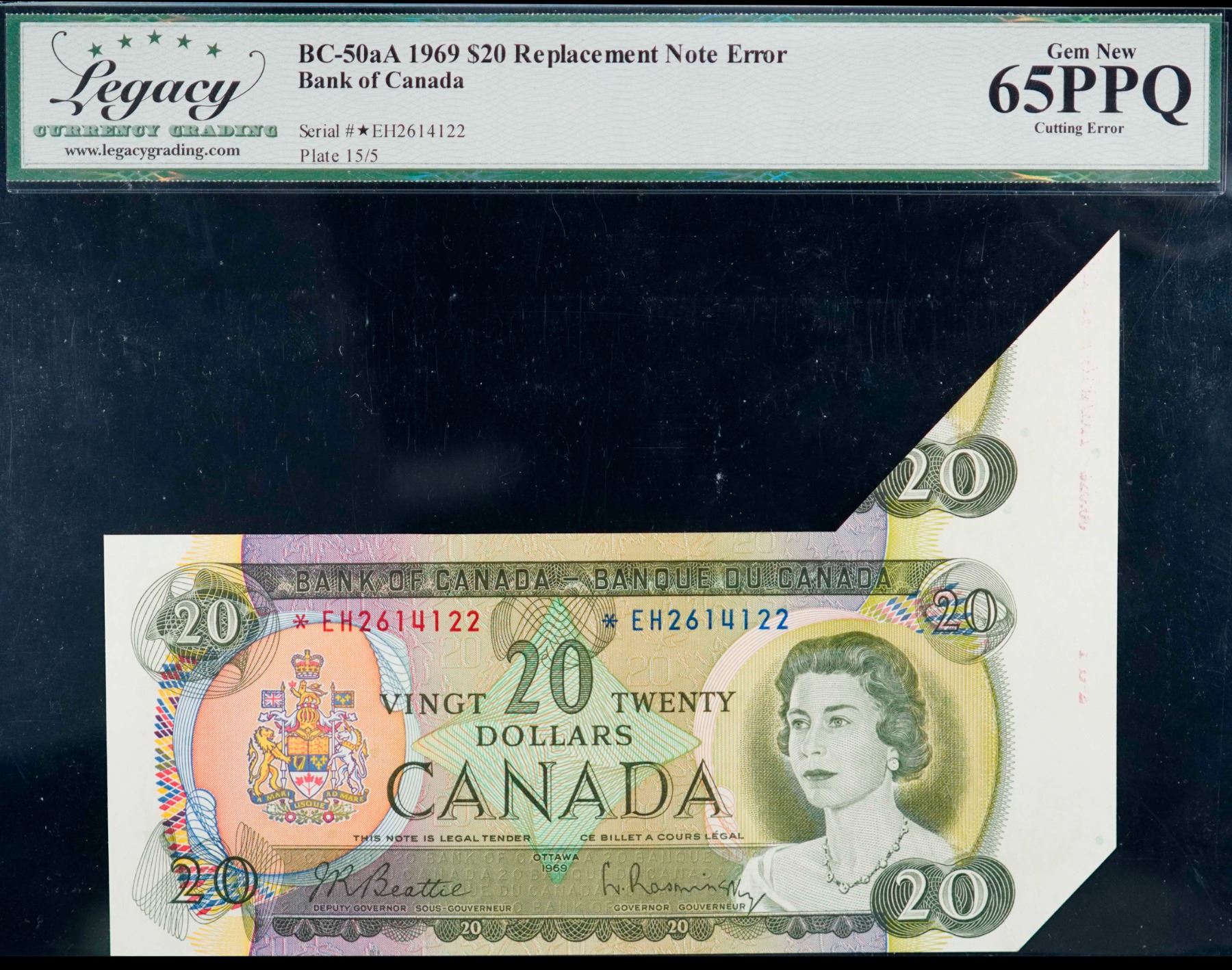 Error; 1969 $20 BC-50aA #*EH2614122, LCG Gem Uncirculated-65PPQ. Fold/cutting error with salvage on a Replacement note. A spectacular example! The same type Error example sold as Lot #552 in the Prominence IV sale for $15,470.