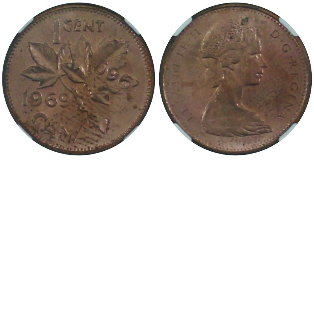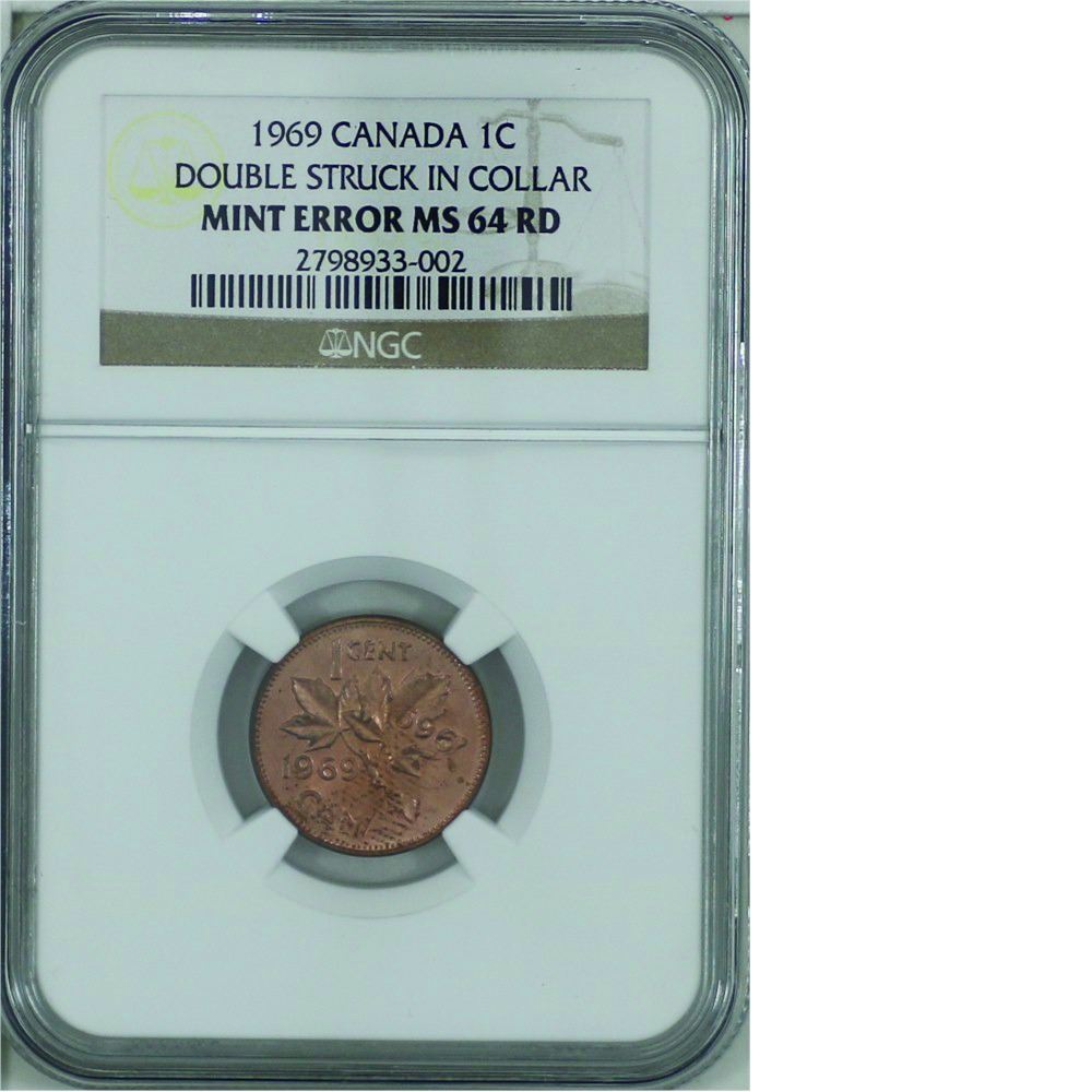 Error 1969 Canada 1-cent Double Struck in Collar NGC Certified MS-64 RB. An impressive reverse features the date struck in 2 locations.
