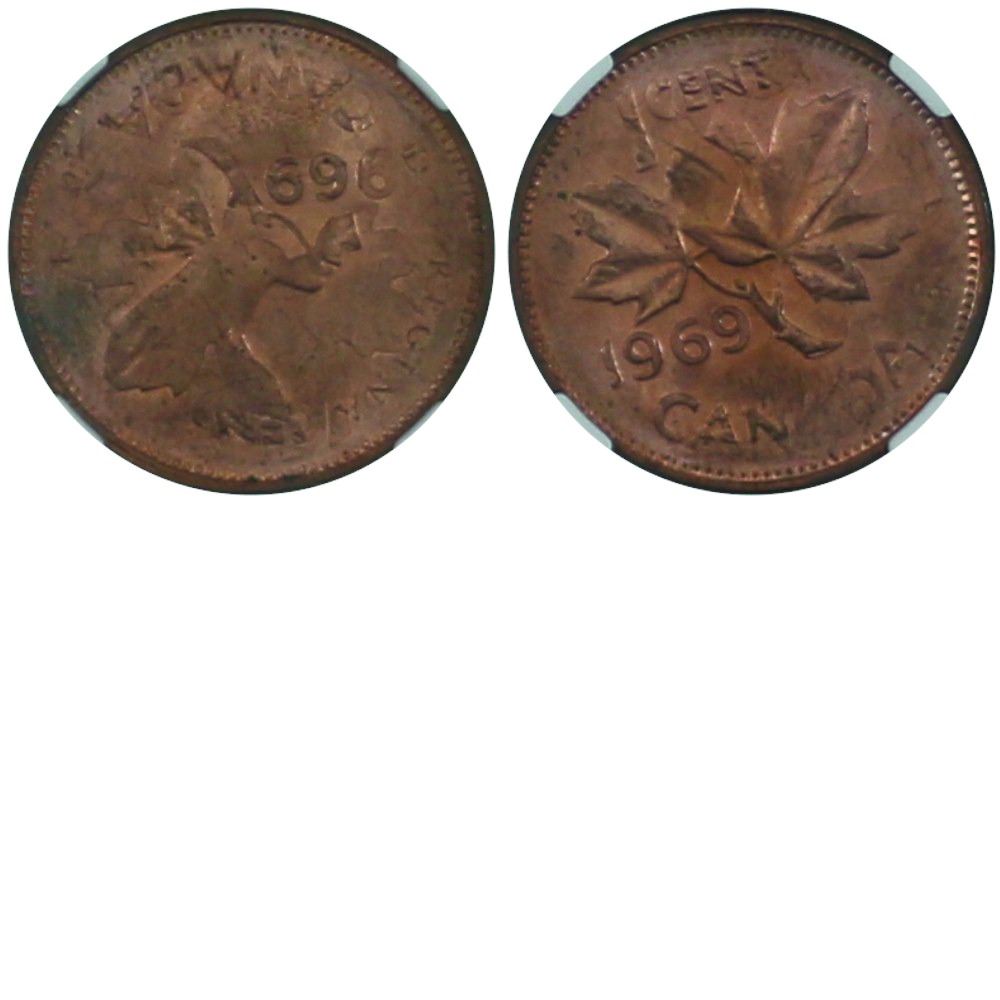 Error 1969 Canada 1-cent Flipover Double Struck NGC certified MS-64 RB. This unique error features the date across the Queen's portrait.