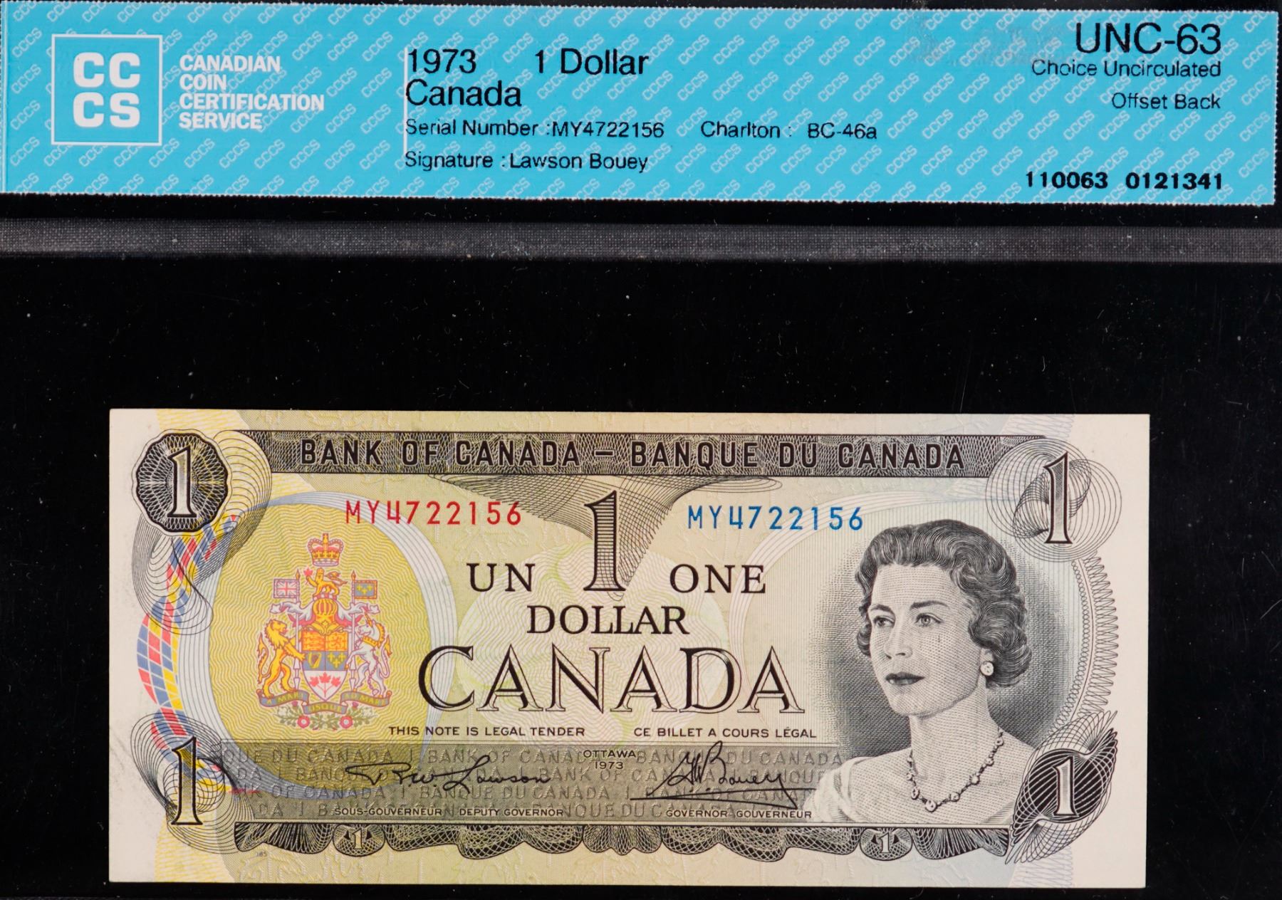 Error; 1973 $1 BC-46a #MY47722156 CCCS Choice Uncirculated-63 - Offset back