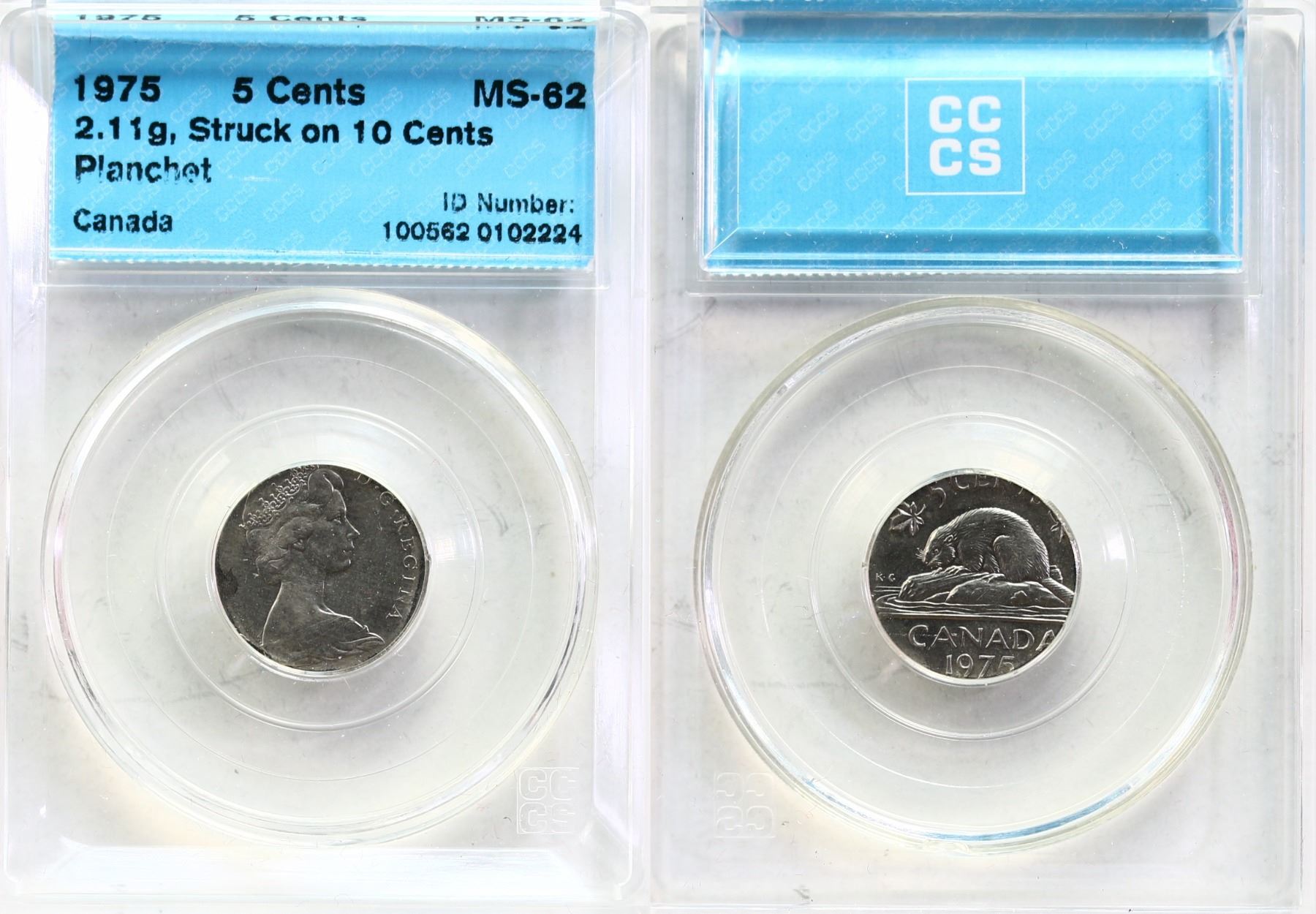 Error; 1975 5¢, CCCS MS62. Struck on 10¢ planchet, weighs 2.11 grs.