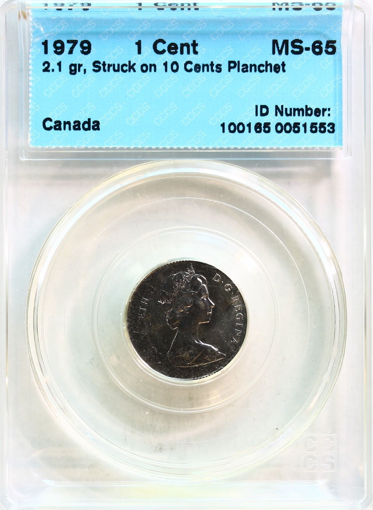 Error; 1979 1¢ "Struck on 10 cent Planchet" 2,1 Grams CCCS MS65
