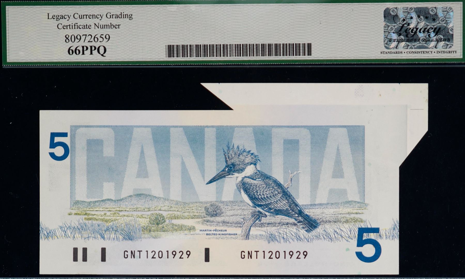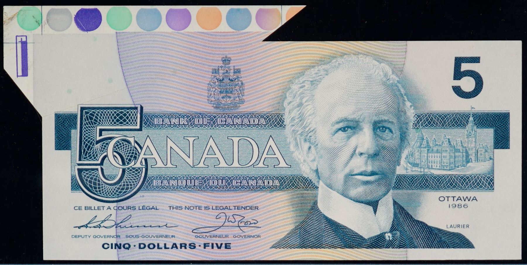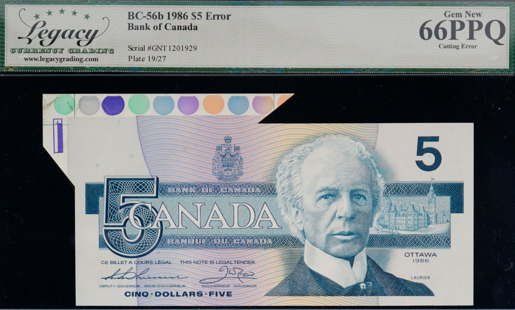 Error; 1979 $5 BC-53b #30485481690 Legacy Currency Grading Choice About Uncirculated-58PPQ "Major Cutting error showing the top left colour bar code" Errors on 1979 notes are very scarce and not often seen.