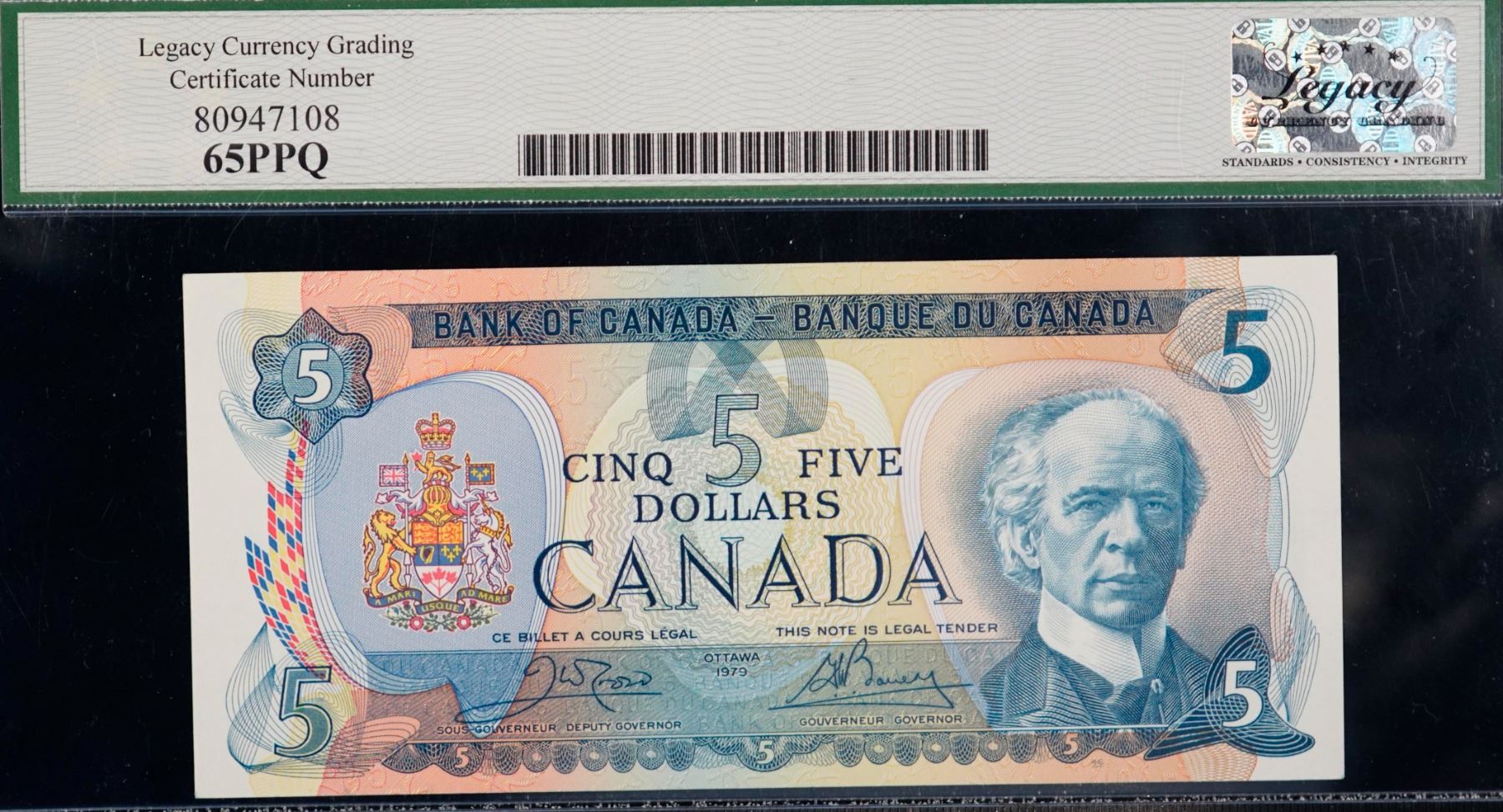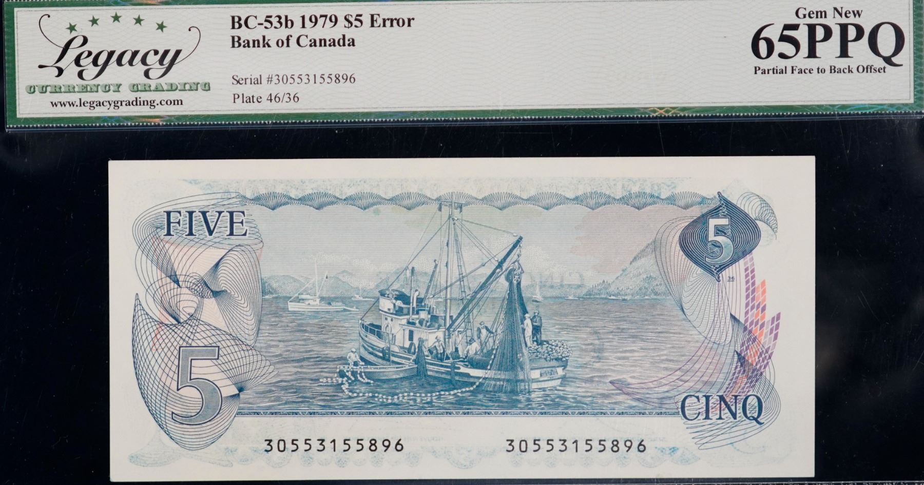Error; 1979 $5 BC-53b #30553155896 Legacy Currency Grading Gem Uncirculated-65PPQ Partial Face to back Offset. Rarely seen