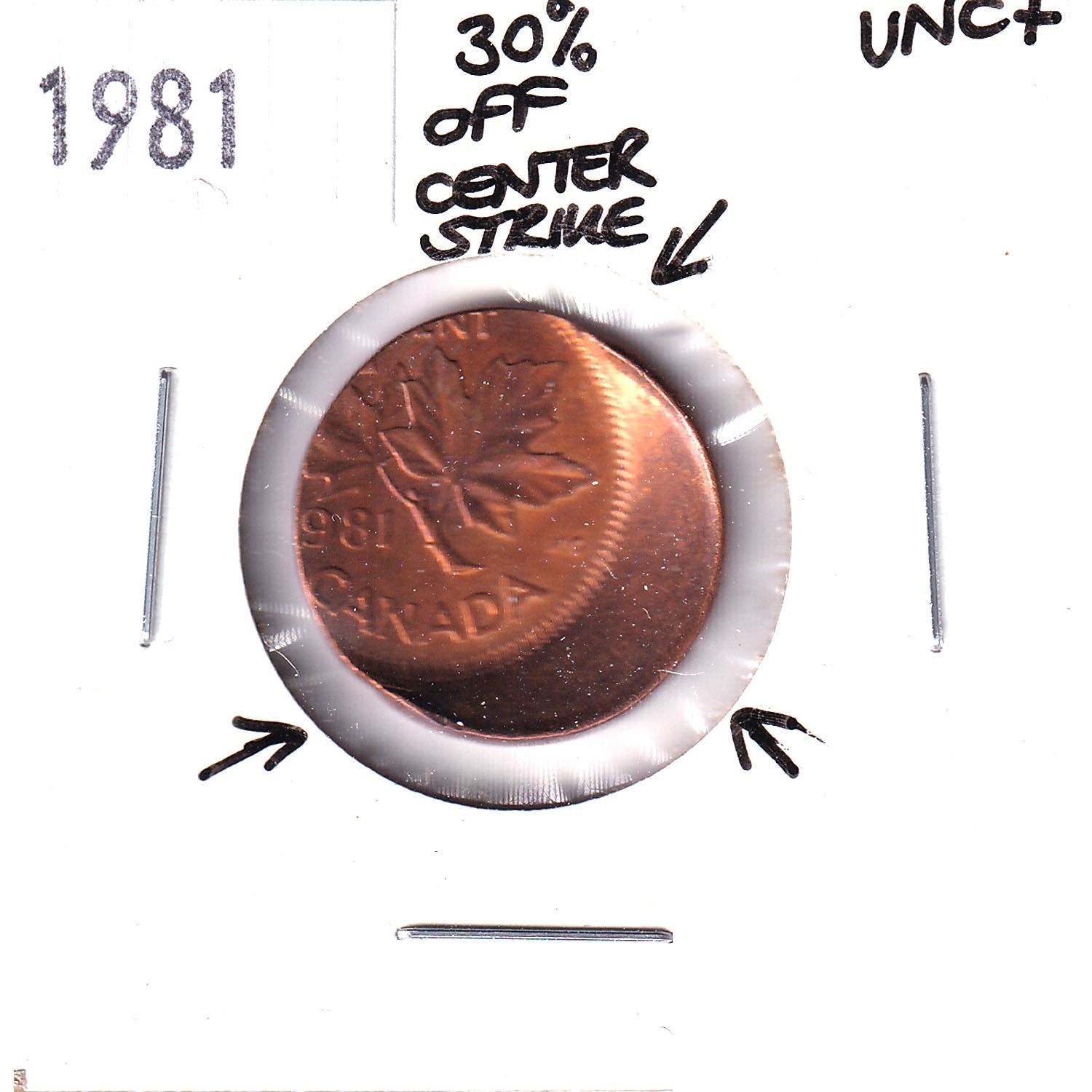 Error! 1981 Canada 1-cent with 30% Off Center Strike Error UNC+.