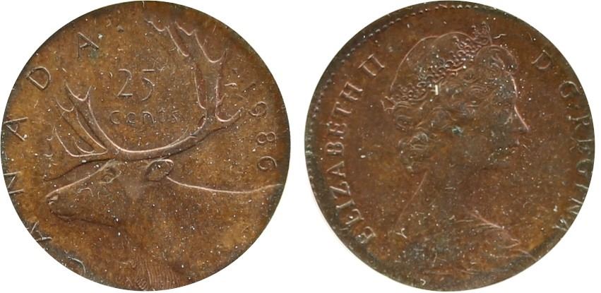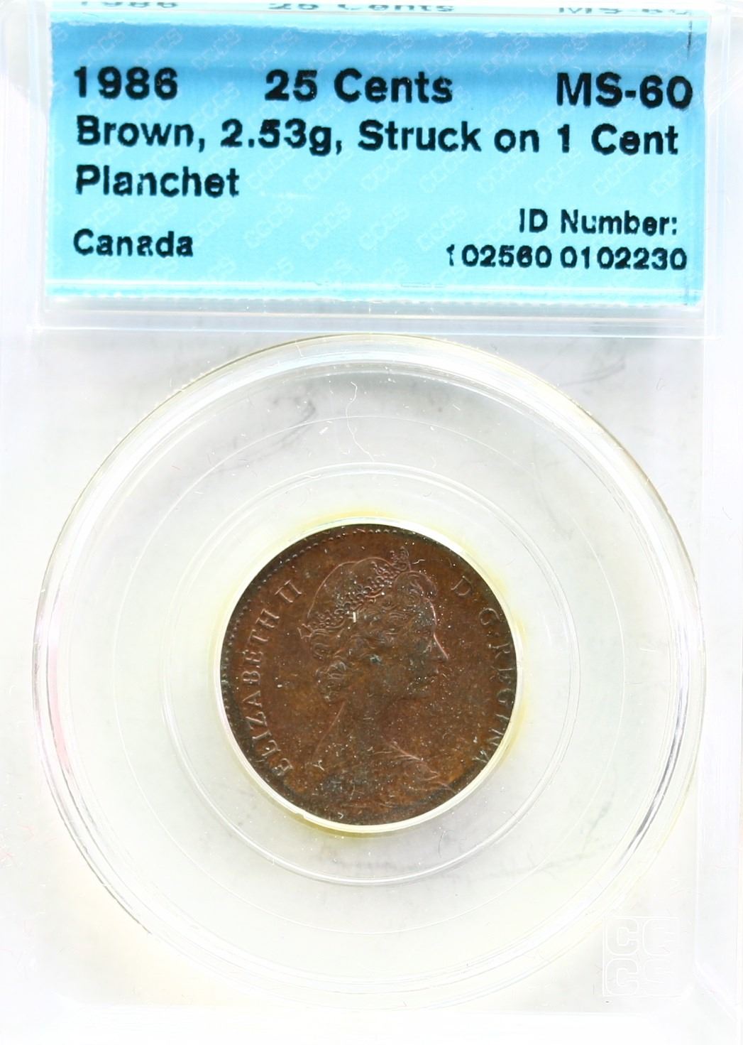 Error; 1986 25¢, CCCS MS60. Struck on 1¢ planchet, weighs 2.53 grs.