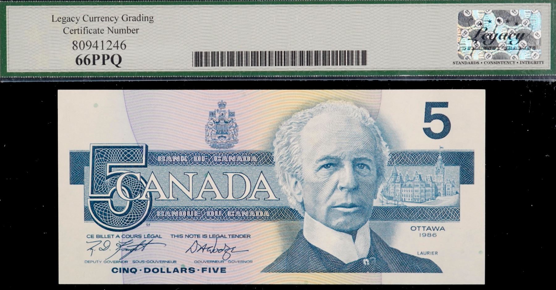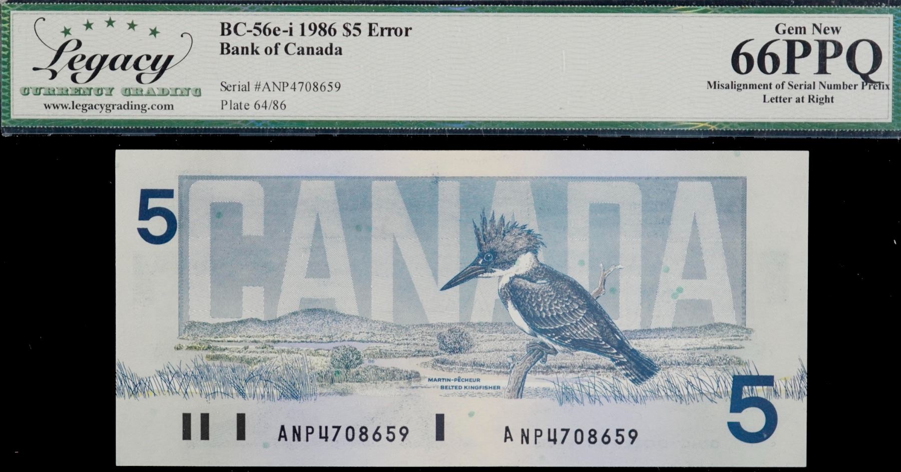 Error; 1986 $5 BC-56e-i #ANP4708659 Legacy Currency Grading Superb Gem Uncirculated-66PPQ "Misalignment of Serial Number prefix Letter at right"