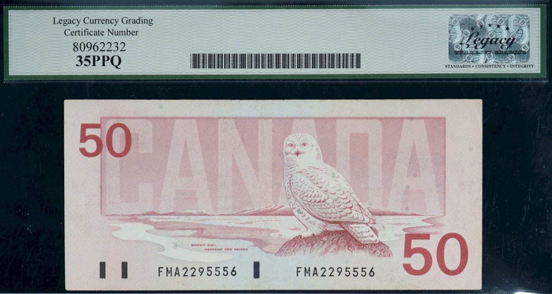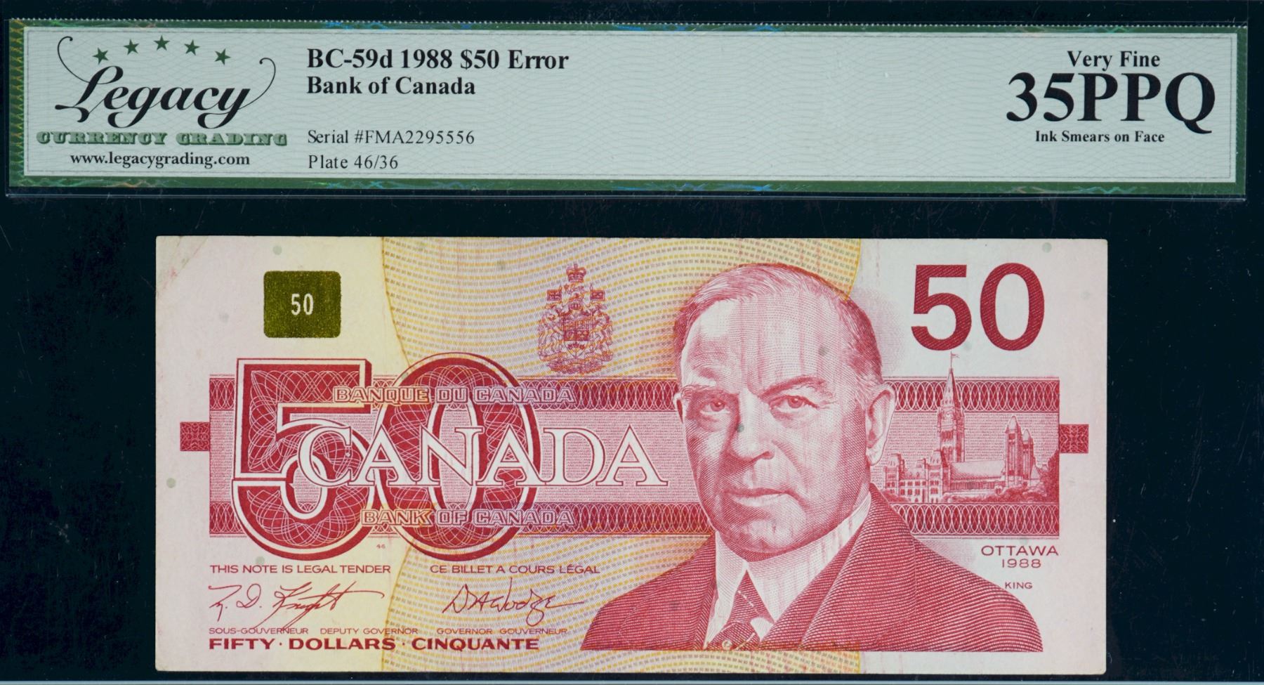 Error; 1988 $50 BC-58d #FMA2295556, Legacy Choice Very Fine-35PPQ w/Ink (roller) smears on Face