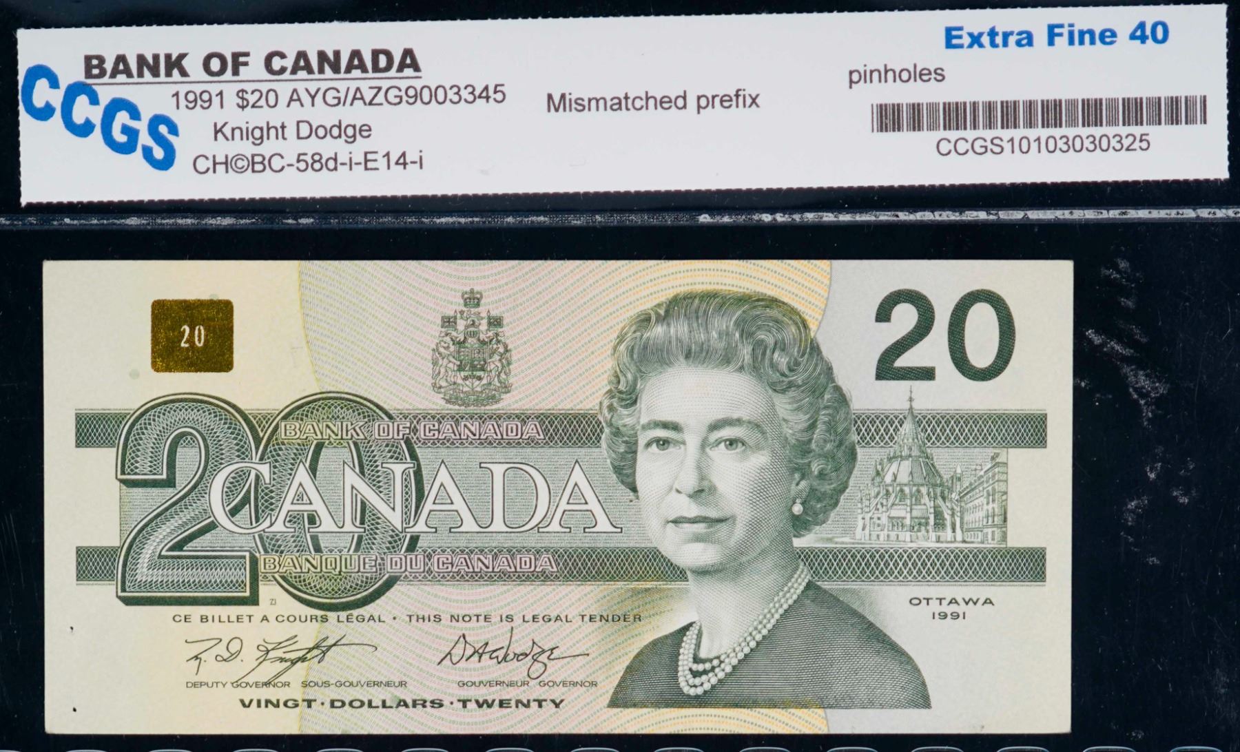 Error; 1991 $20; AYG/AZG "Mismatched Prefix" CCGS Choice Extra Fine-45 with issue