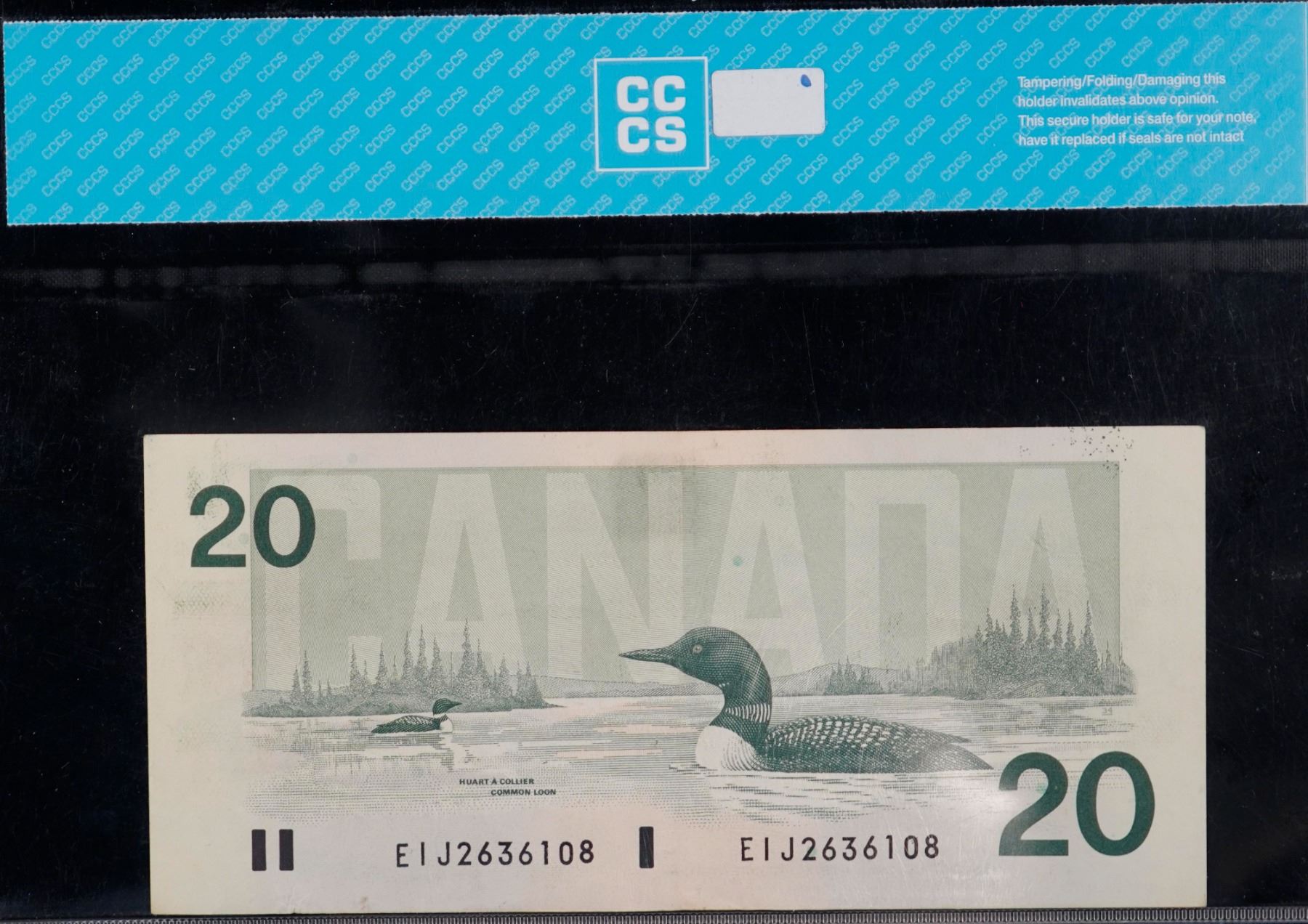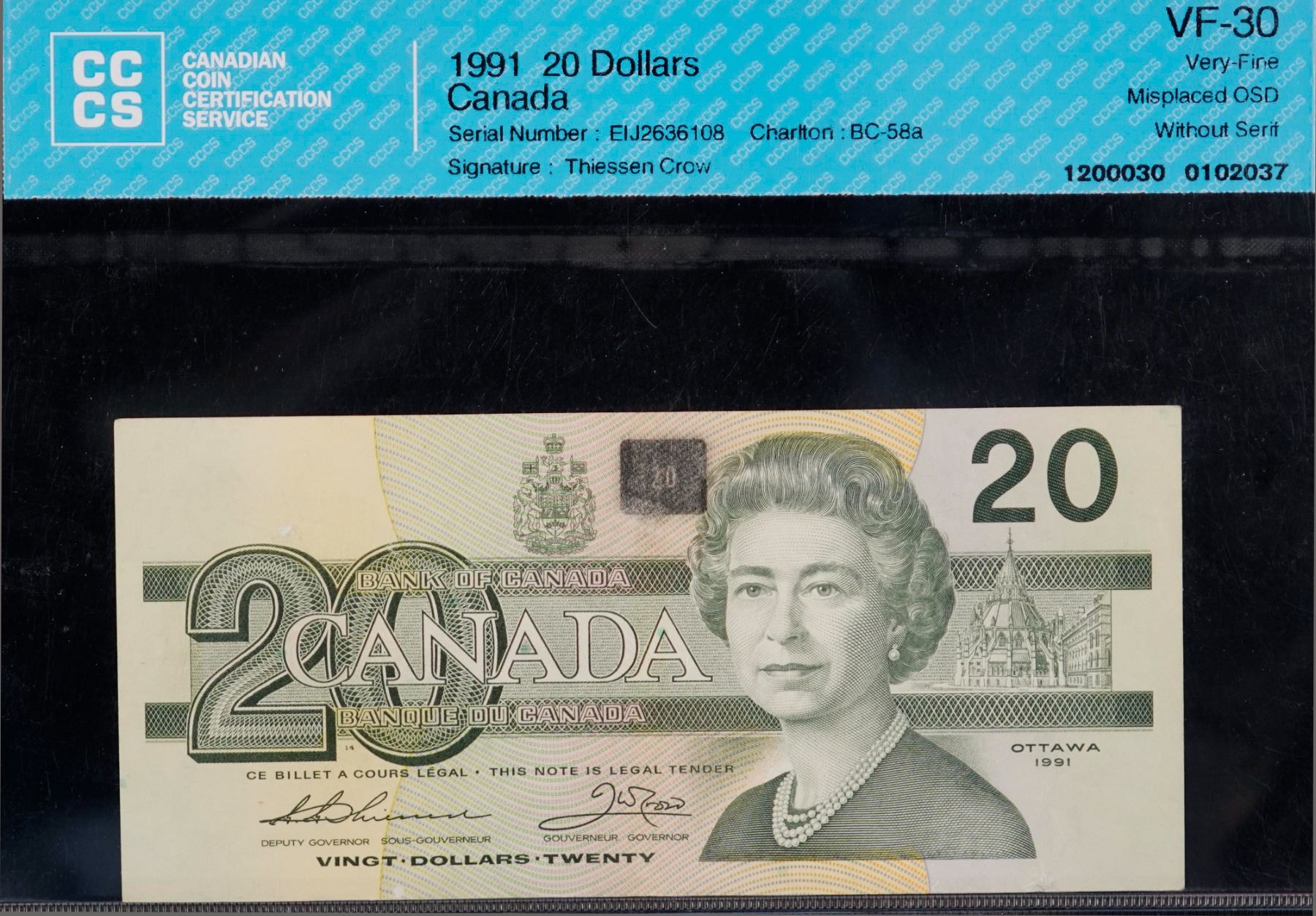 Error; 1991 $20 BC-58a EIJ2636108 CCCS Choice Very Fine-30 "Misplaced OSD"