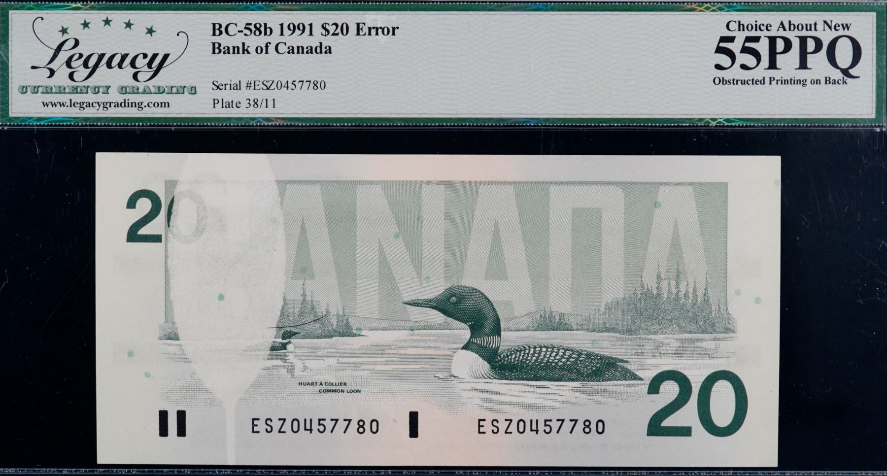 Error; 1991 $20 BC-58b ESZ0457780 Legacy Currency Grading Choice About Uncirculated-55PPQ "Obstructed Printing on Back"