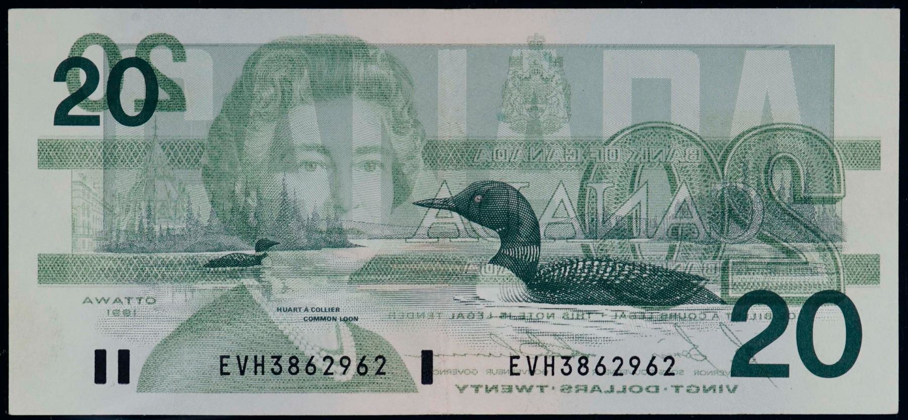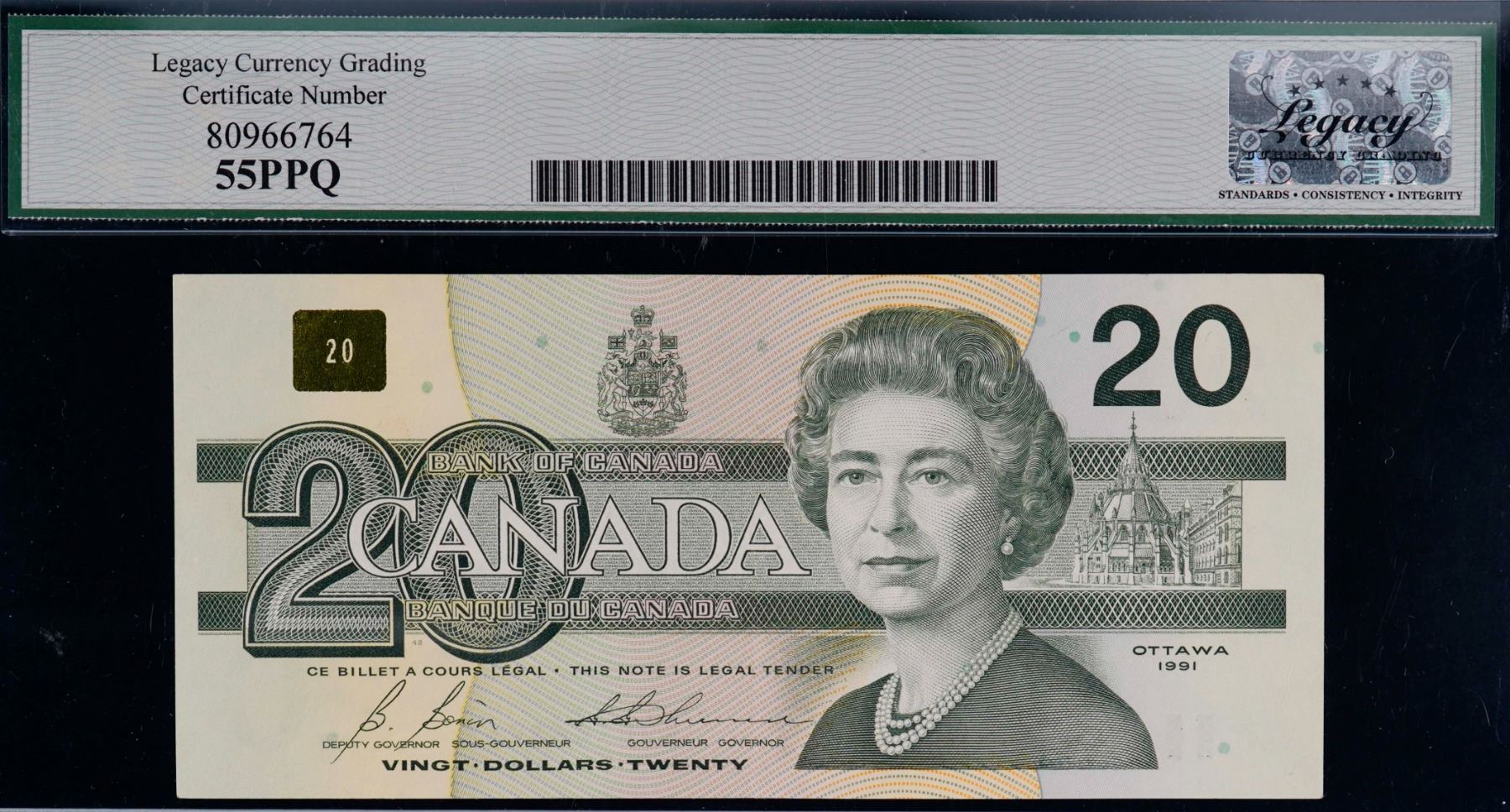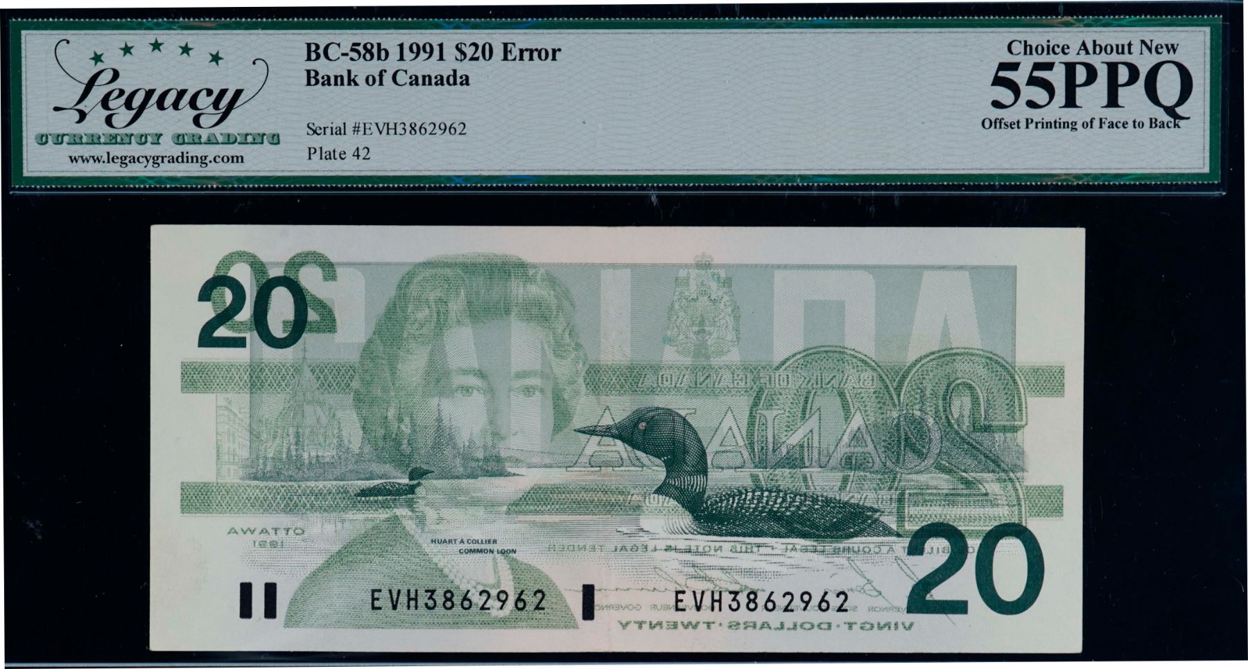 Error; 1991 $20 BC-58b #EVH3862962 Legacy Choice About Uncirculated-55PPQ. Full offset printing on face to back.