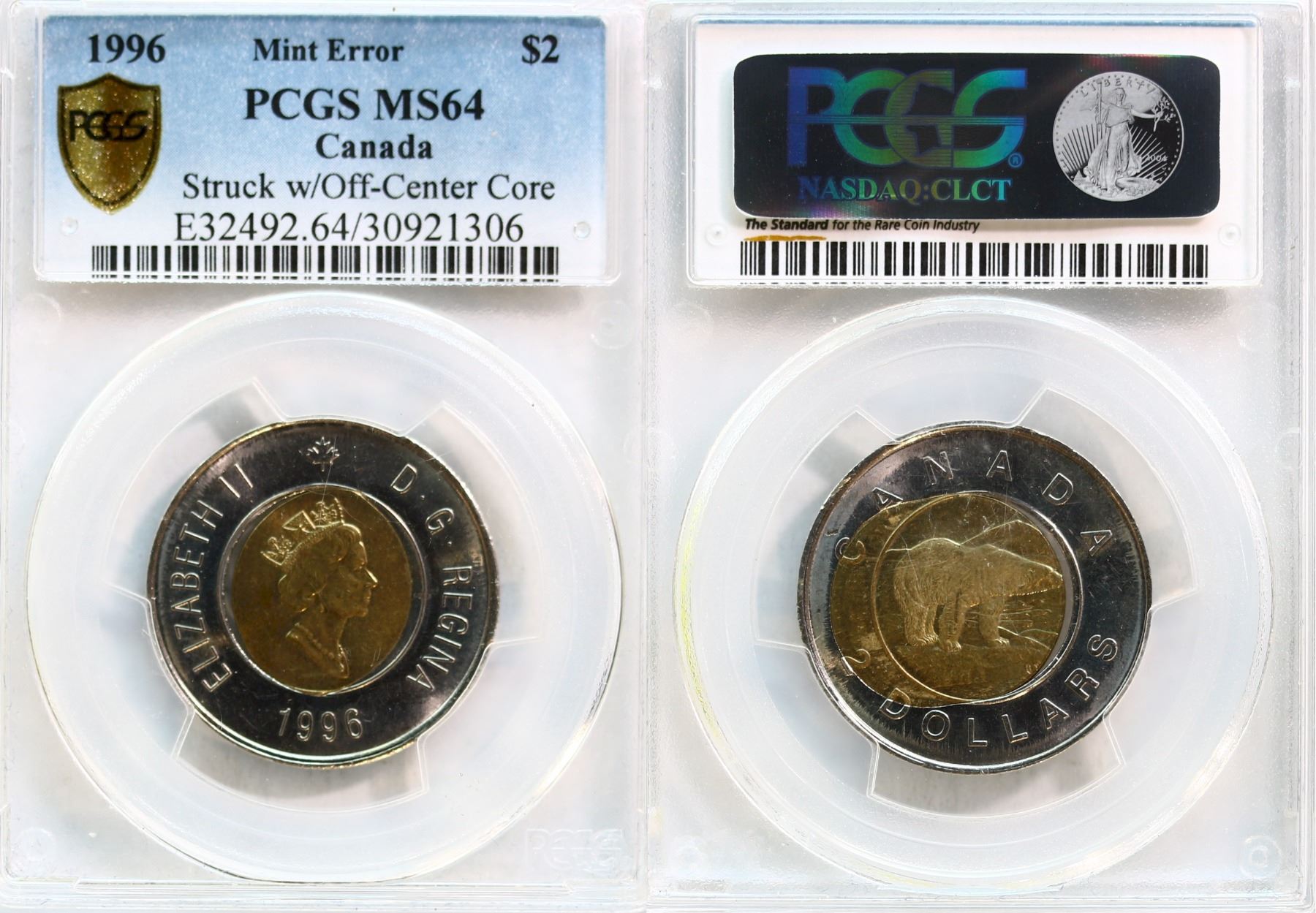 Error; 1996 $2 "Struck w/Off-Center Core" PCGS MS64
