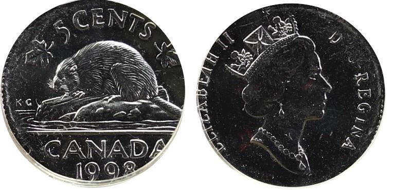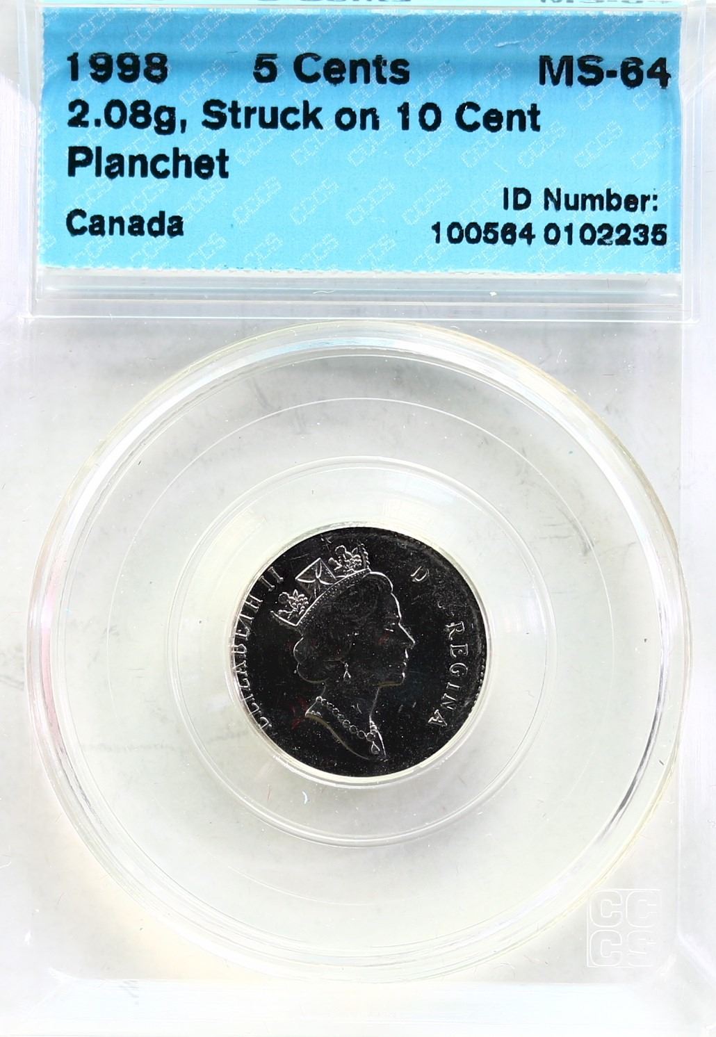 Error; 1998 5¢, CCCS MS64. Struck on 10¢ planchet.