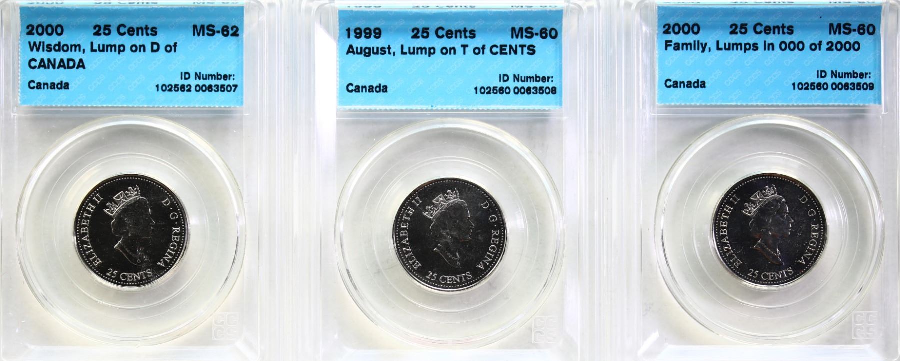 Error; 1999 25¢ August, 2000 25¢ Wisdom & Family. Lot of 3 CCCS graded MS60-MS62 coins both designated w/Lump varieties. See Pic.