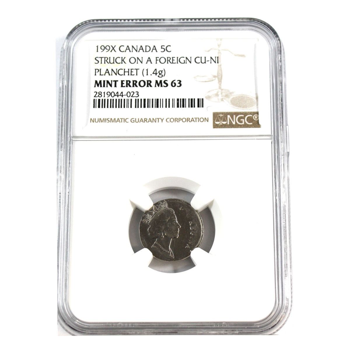 Error, 199X Canada 5-cent Struck on a Foreign CU-NI Planchet (1.4g). NGC Certified MS-63.
