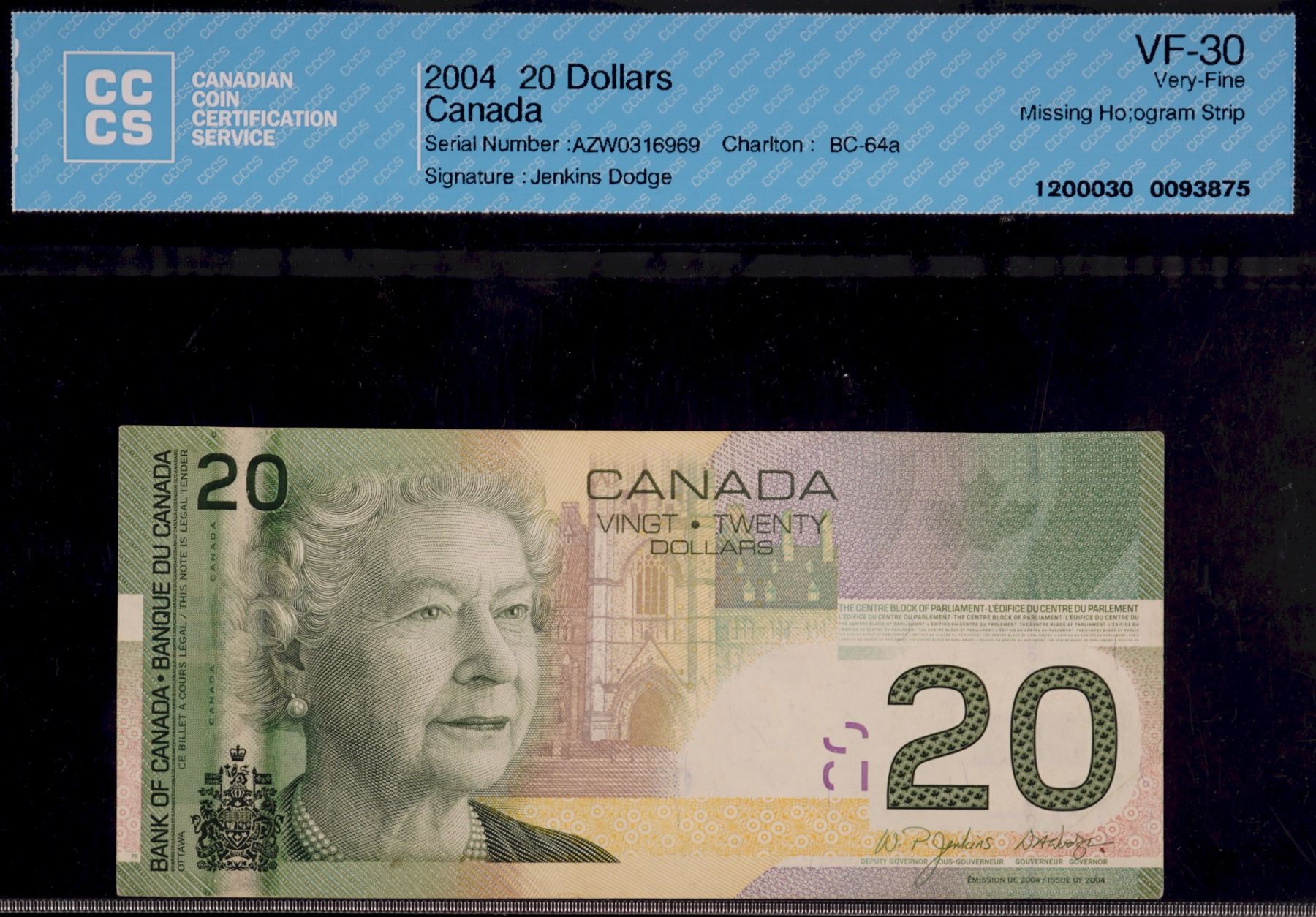 Error; 2004 $20 #AZW0316969 CCCS Choice Very Fine-30. Missing Hologram Strip.
