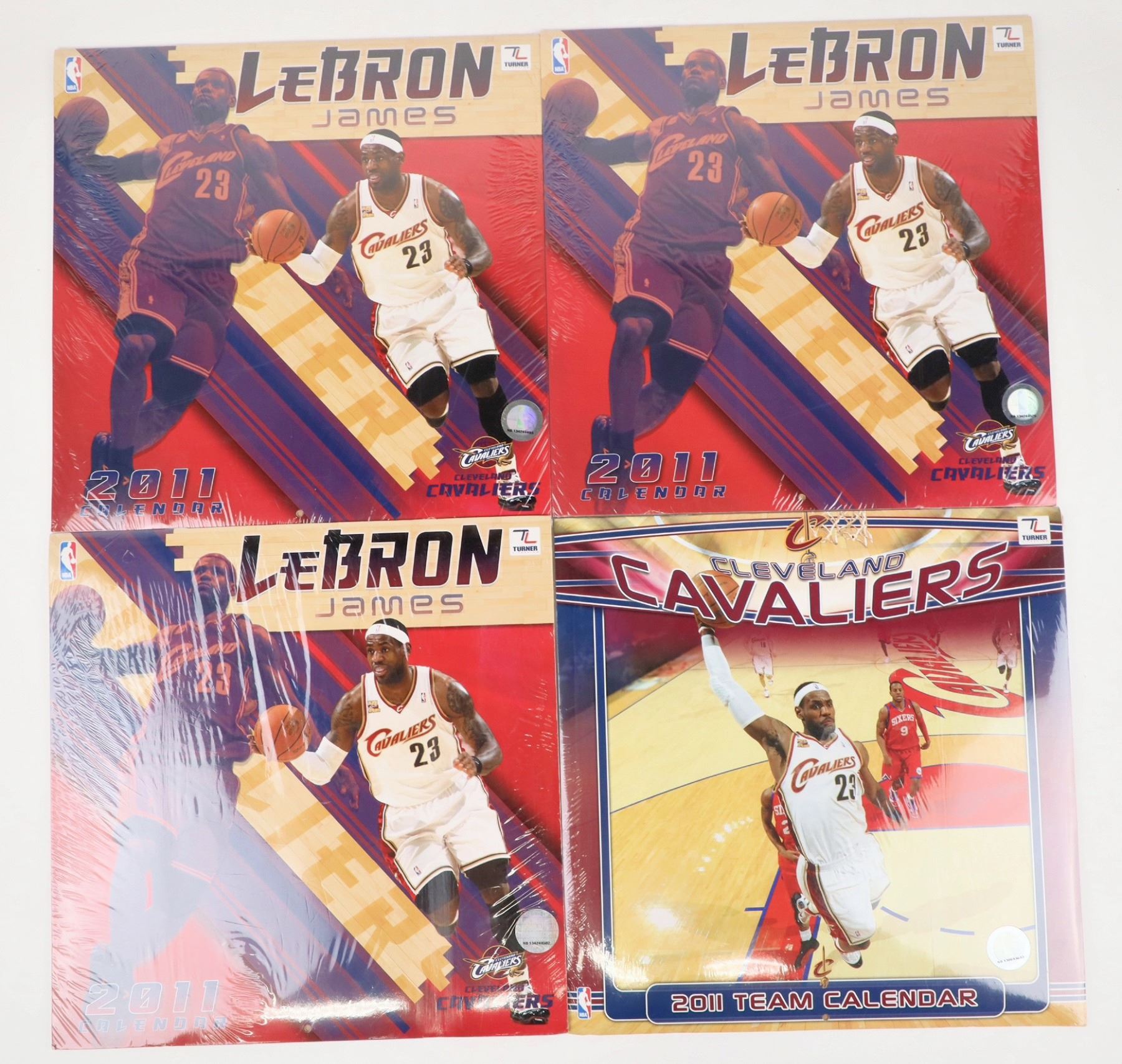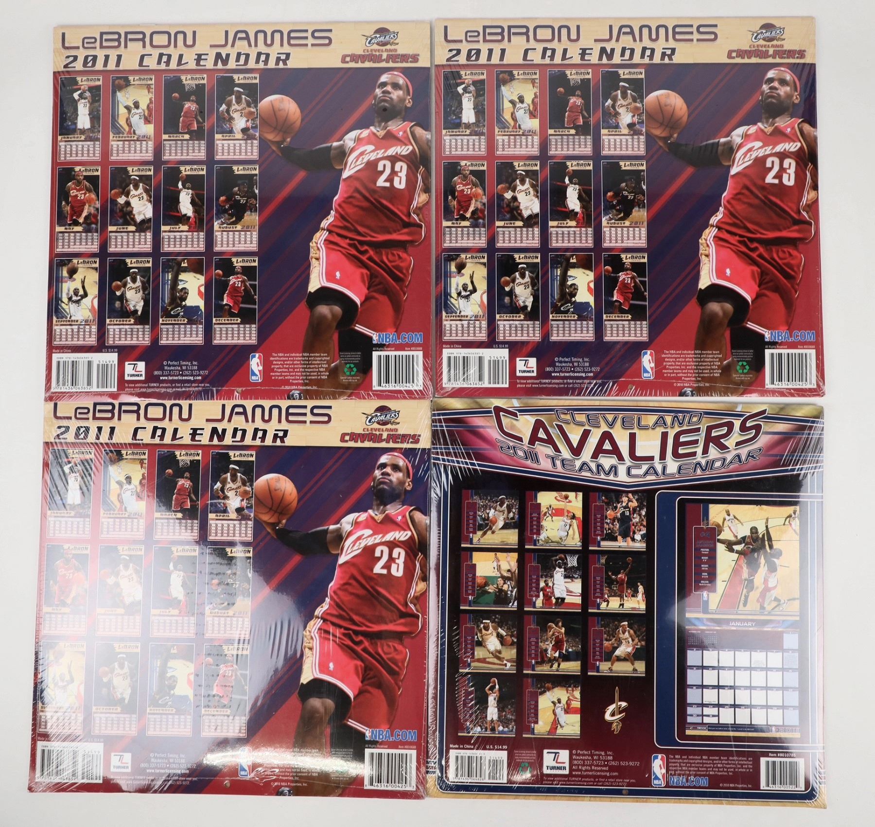 Group of 4, two varieties. Three are Lebron James centered calendars. The fourth is a team calendar with Lebron on the cover. All still sealed in plastic. The problem: LeBron James did not play for the Cleveland Cavaliers in 2011. He left Cleveland in the summer of 2010 and played for the Miami Heat from 2010–2014. In 2011, he was in his first season with Miami, appearing in the NBA Finals that year.