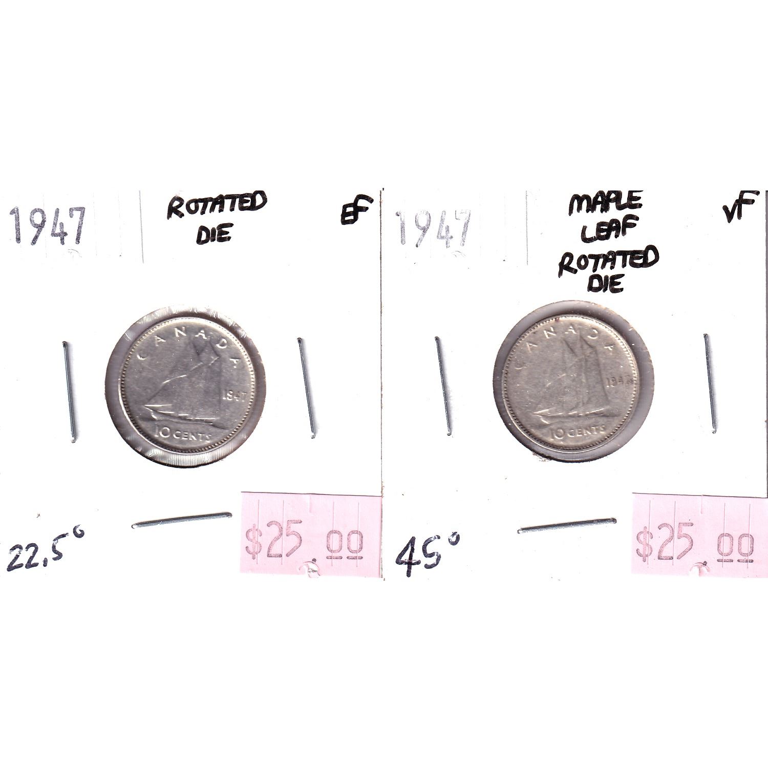 Error: 2x 1947 10-cent with Rotated Dies. 1947 in EF with an approximate 22.5 degree rotation and a 1947 ML in VF with an approximate 45 degree rotation. 2pcs