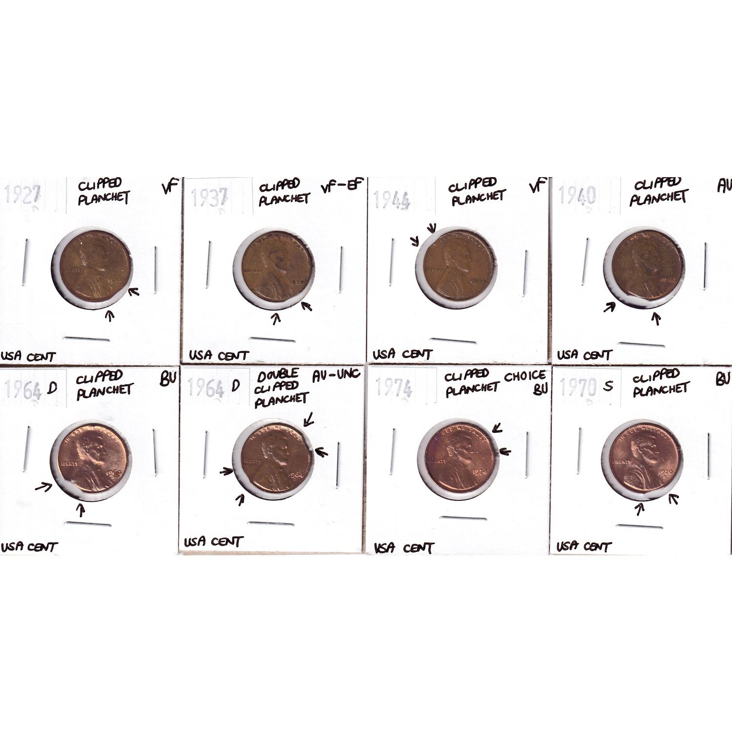Error: 8x United States 1-cent with Clipped Planchets. Dates include: 1927, 1937, 1940, 1944, 2x 196