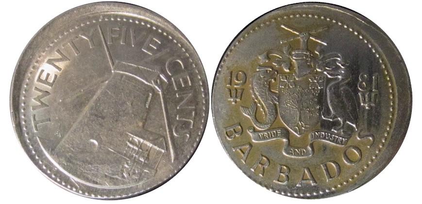 Error Bahamas 1981 25¢. Offstrike, with cap like finish.