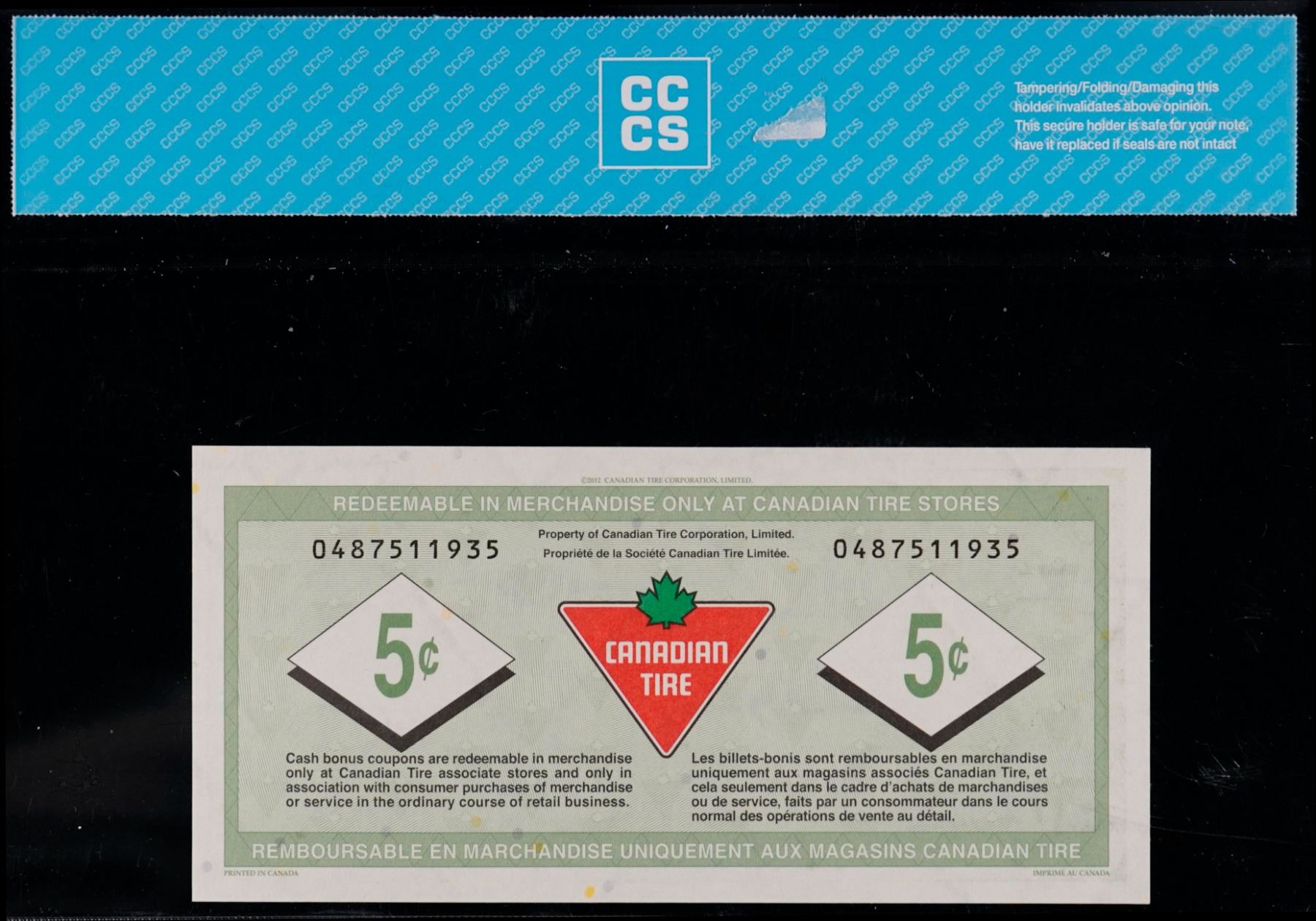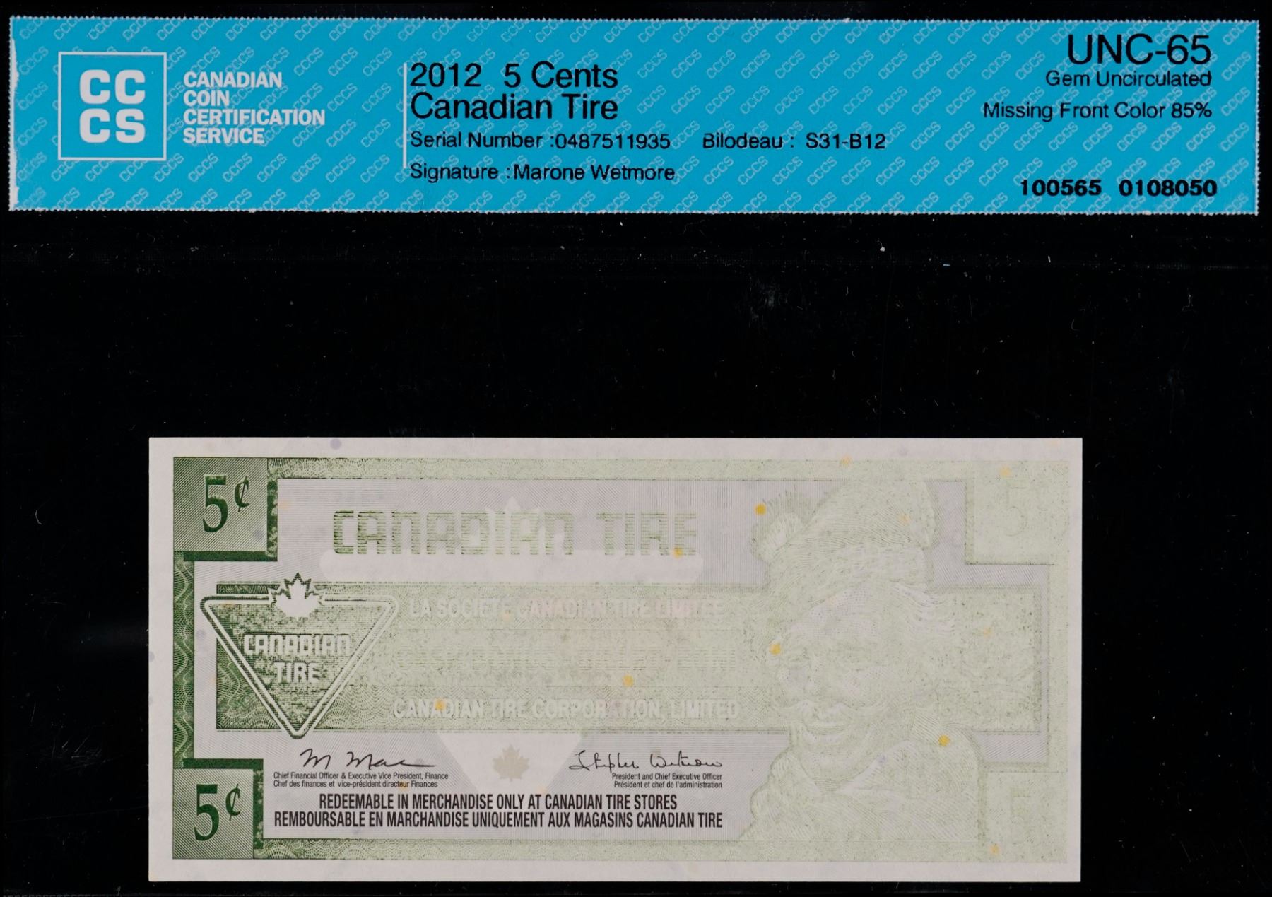 Error; Canadian Tire S-31, B12 #0487511935 CCCS UNC65. Missing 85% front Colour