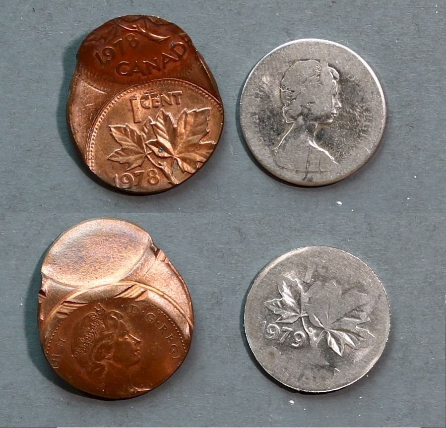 Error Coin; 1979 10¢ Struck on foreign planchet, weighs 2,1 grs, looks silver (non magn) & 1978 1¢ Double Struck. Lot of 2 coins.