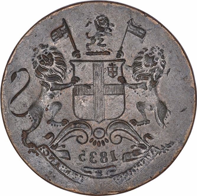 1835, East India Company,Copper 1/4 Anna,BrockageError, Error: complete clear obverse lakhi brockage with deep full impression ofobverse atreverse, about very fine,Very Rare.
