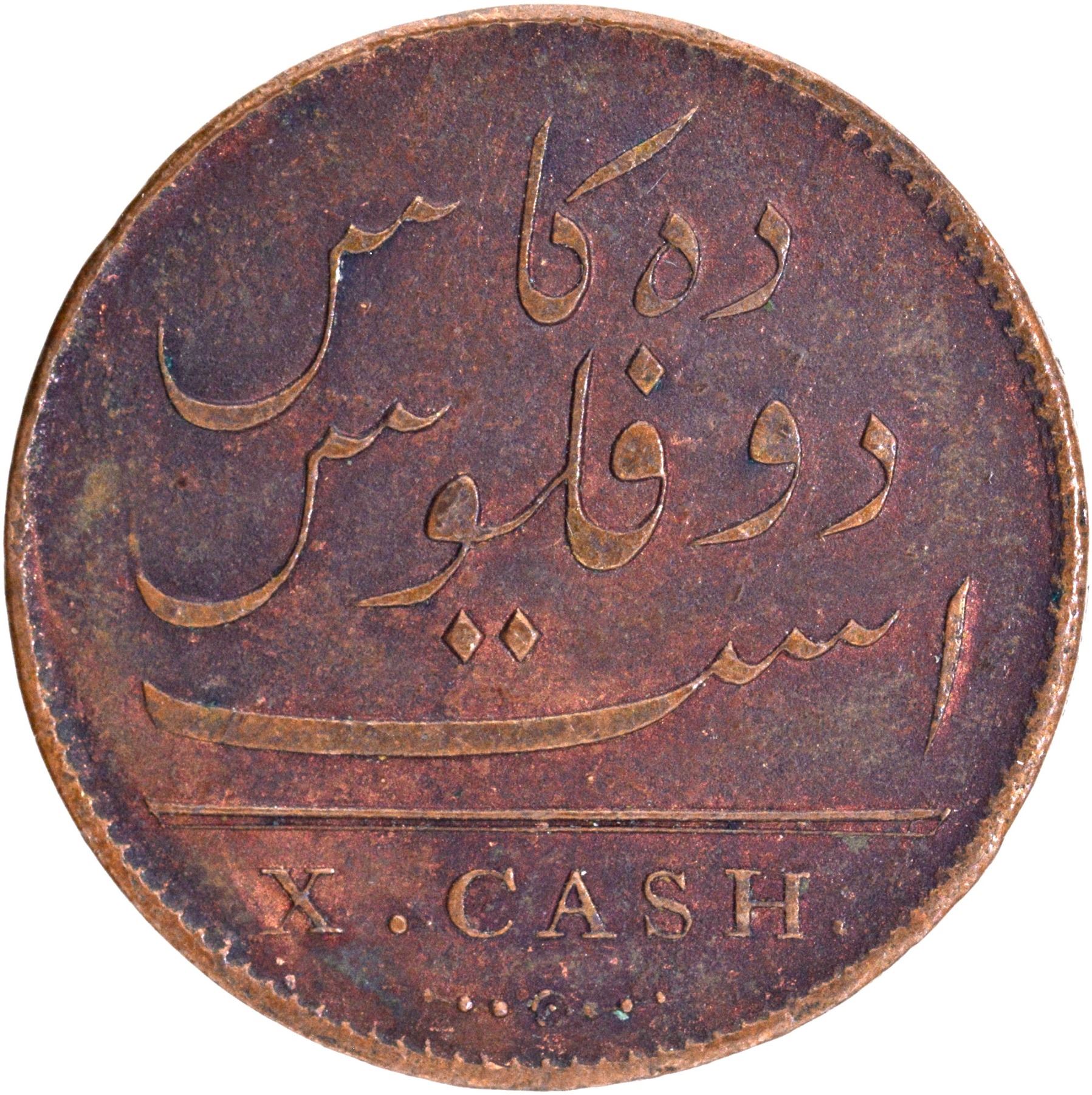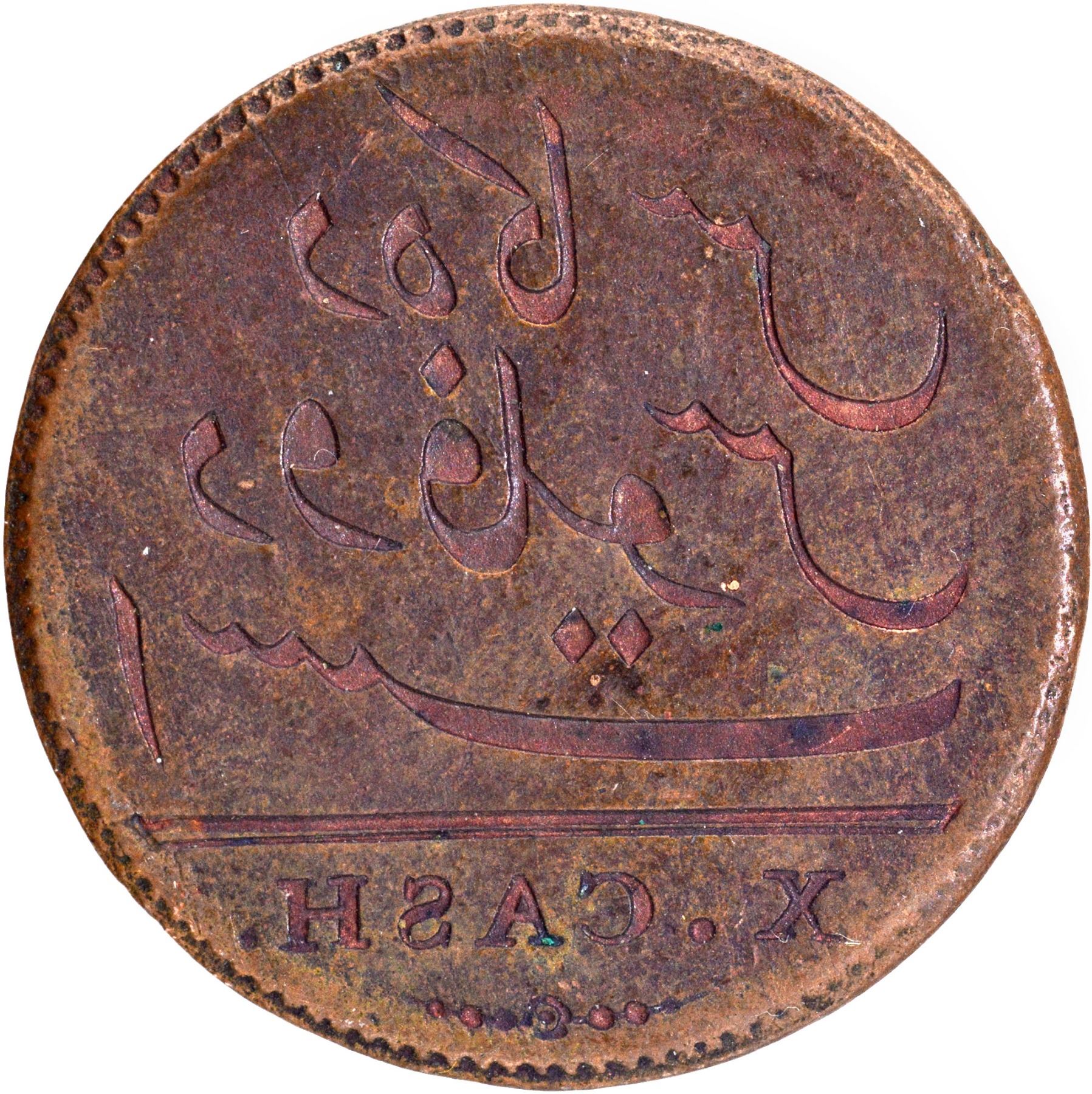 Madras Presidency, Copper 10 Cash, 1808, Error: Obverse Lakhi/ Brockage,complete and deep lakhi brockage on the obverse with mirror impressions,Persian legend dah kas do falus ast with X Cash at the bottom, 4.44g, 25.46mm, VF-XF, Very Rare.