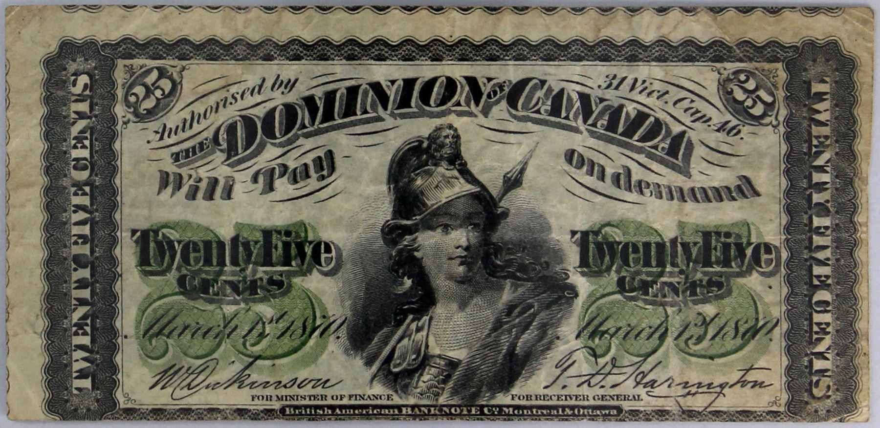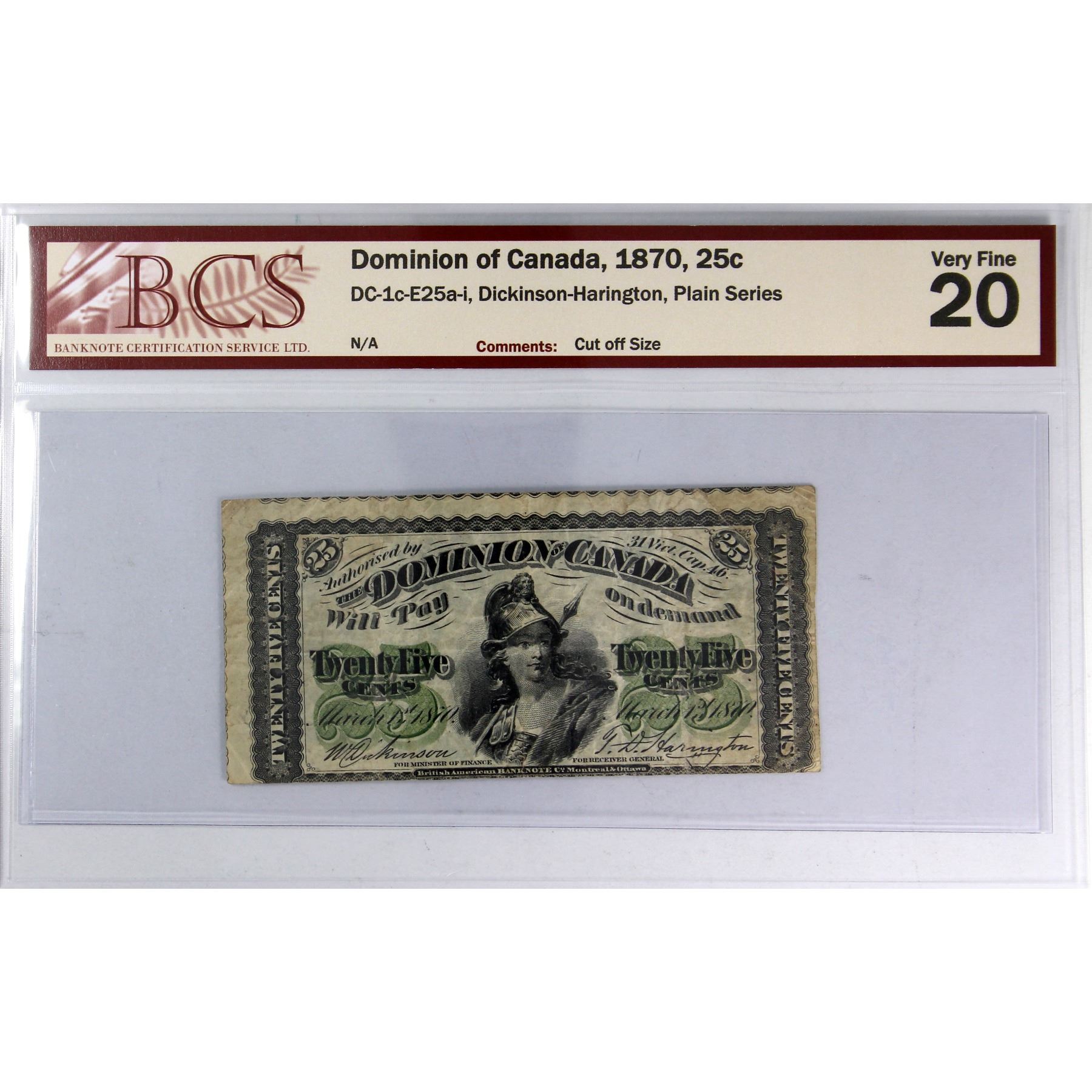 Error DC-1c-E25a-i 1870 25c 'Cut off Size' BCS VF20, Dickinson-Harington Plain Series.