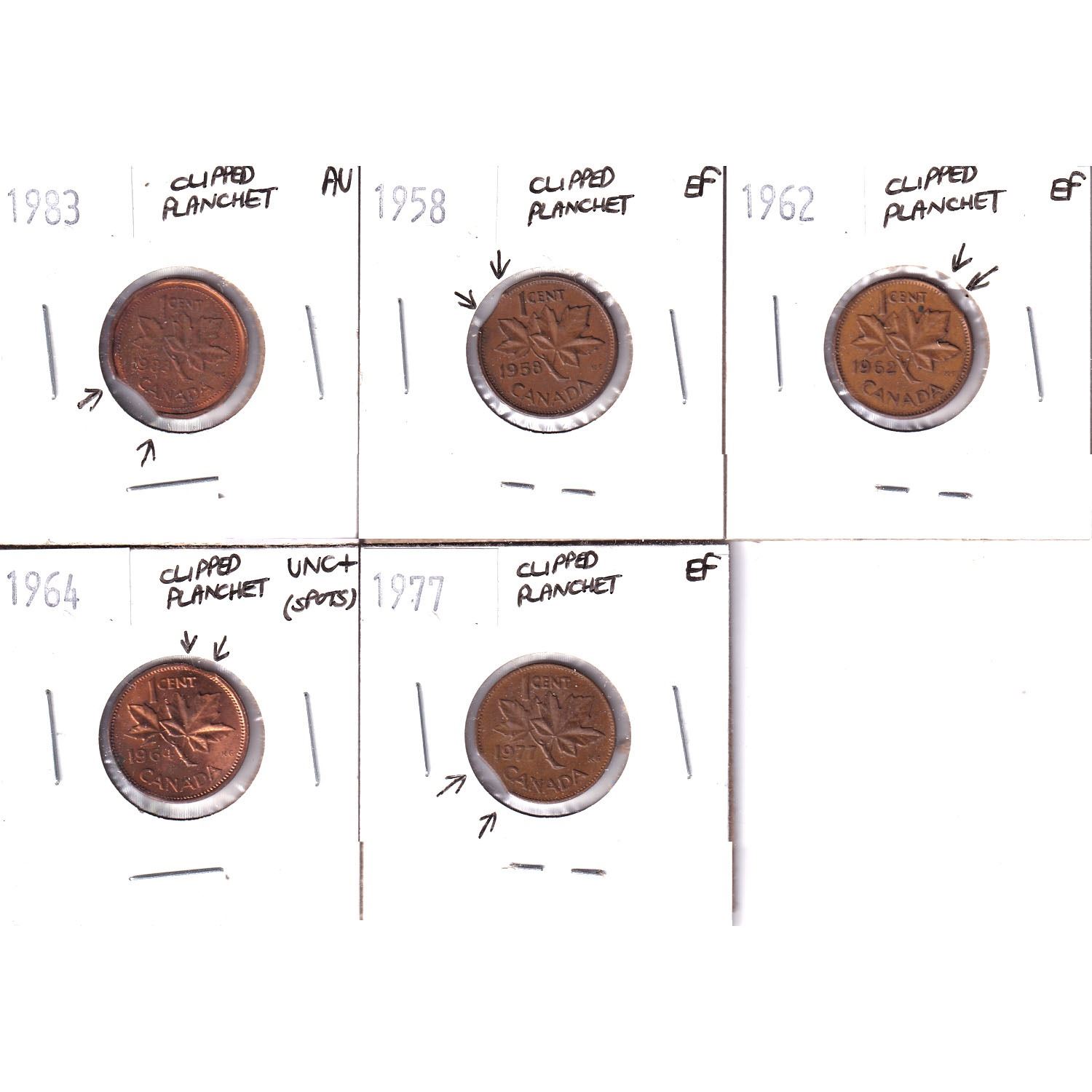 Error Lot! 1958, 1962, 1964, 1977 & 1983 Canada 1-cent with Clipped Planchet Errors Extra Fine, Almost Uncirculated or UNC+. 5pcs