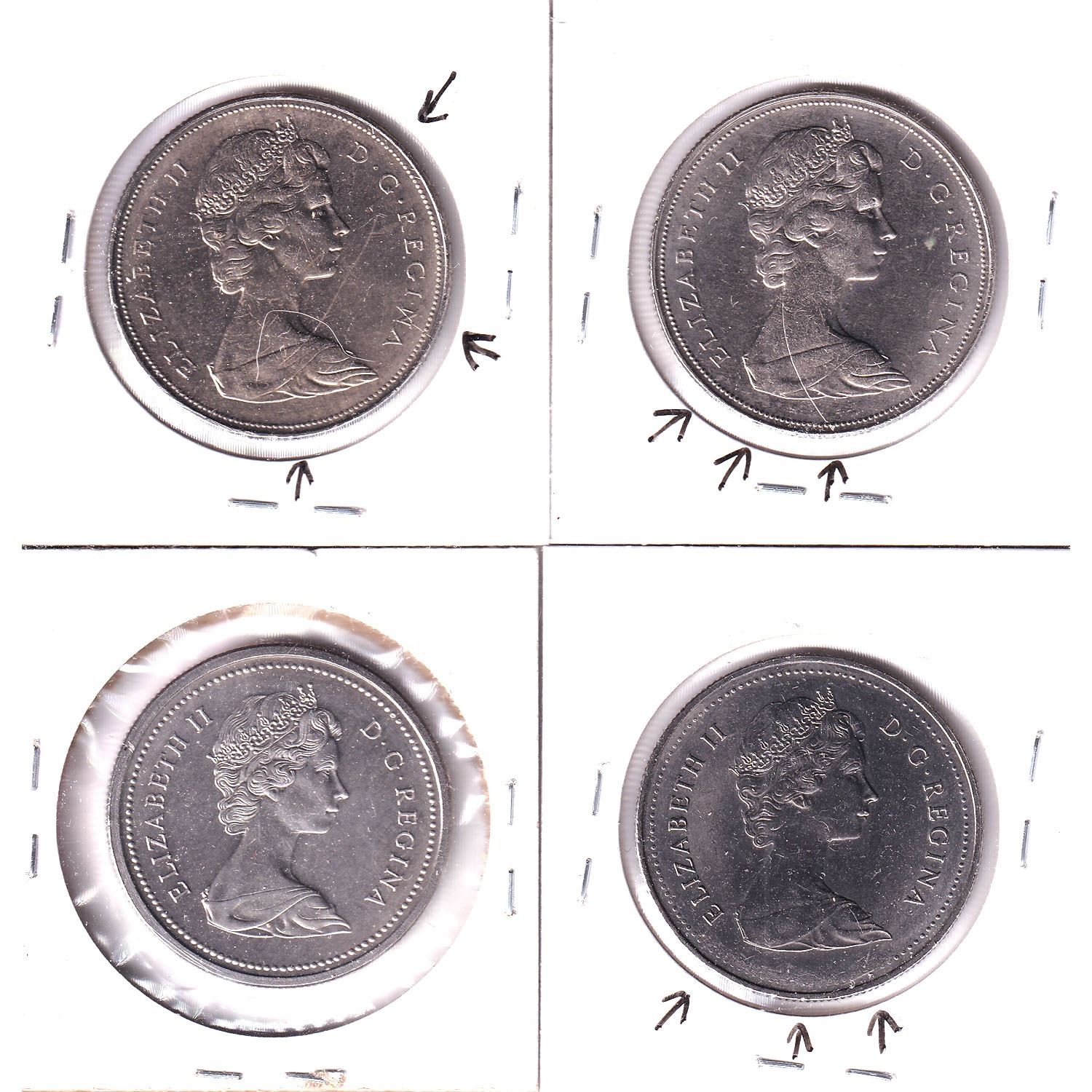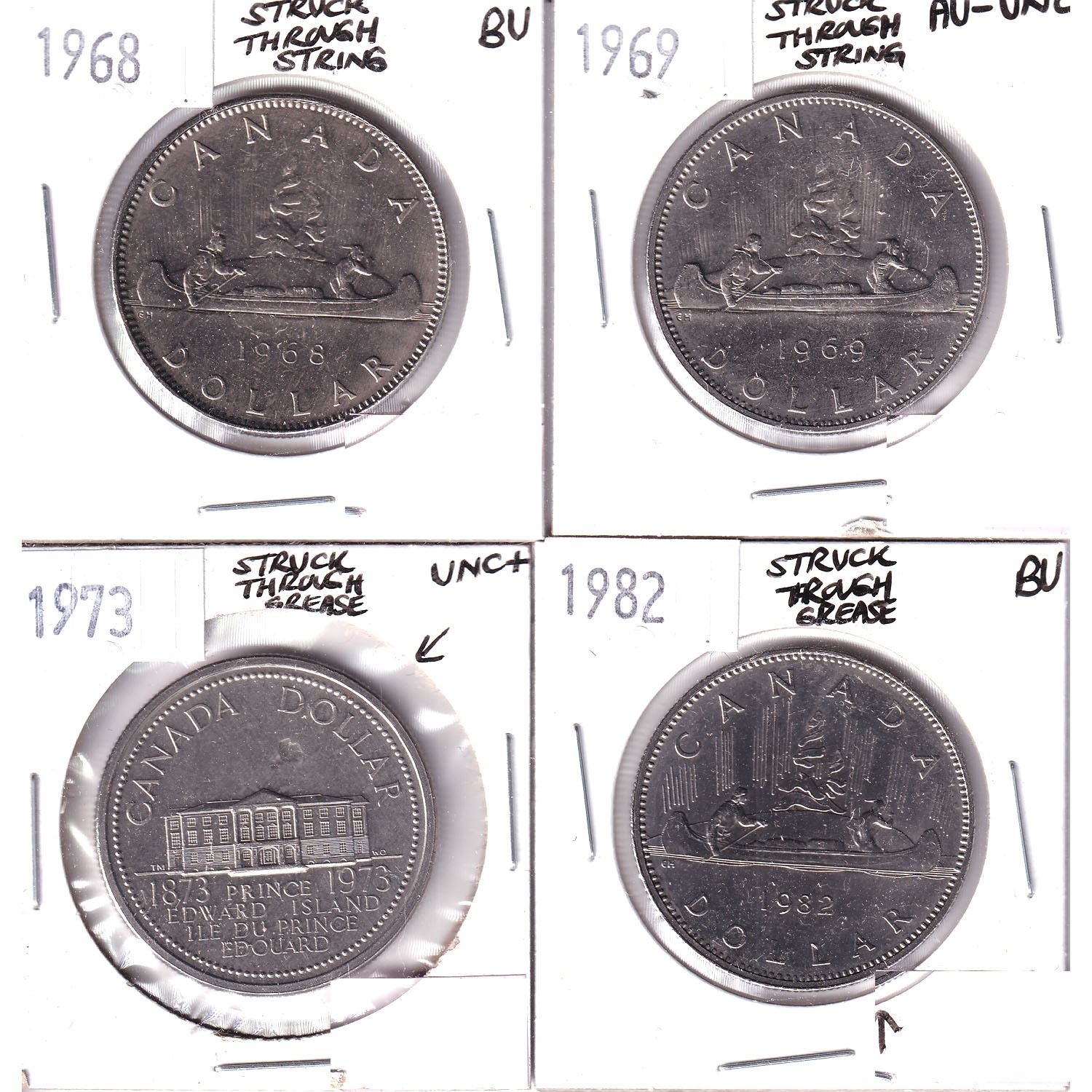 Error Lot! 1968-1982 Canada Nickel $1 Collection. 1968 Struck Through String 'BU', 1969 Struck Through String 'AU-UNC', 1973 Struck Through Grease 'UNC+', & 1982 Struck Through Grease 'BU'. 4pcs