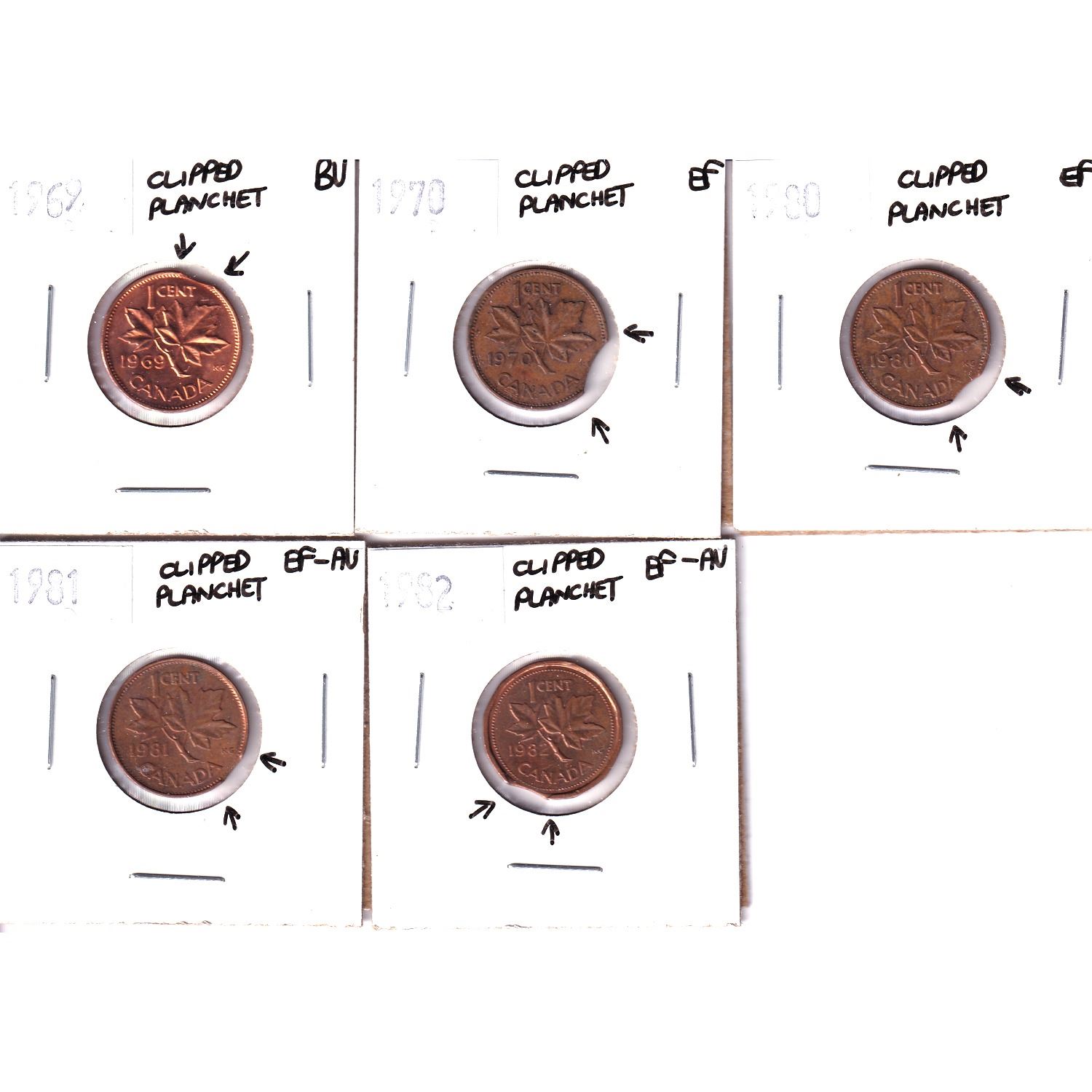 Error: Lot of 5 Canadian 1-cent with clipped planchets, Lot includes 1969, 1970, 1980, 1981, & 1982. Coins range from EF to BU. 5pcs