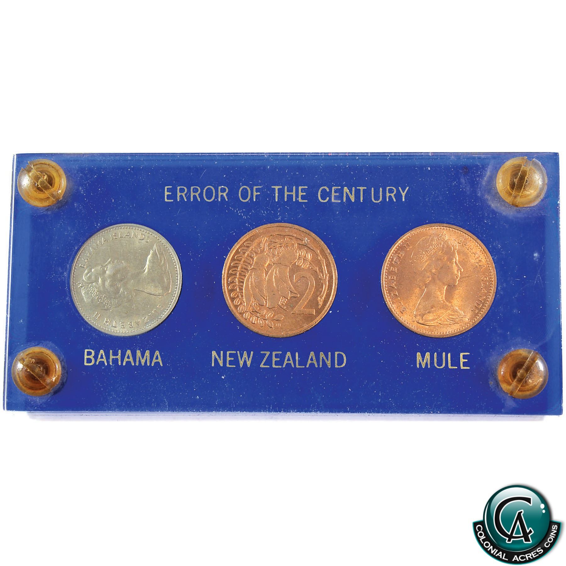 A Very Unique error, where a 1967 New Zealand Copper 2-cent was struck with the proper reverse die, however the obverse die was a Bahama's 1966 5-cent die. Was dubed the "error of the Century". All coins are in Mint state condition.