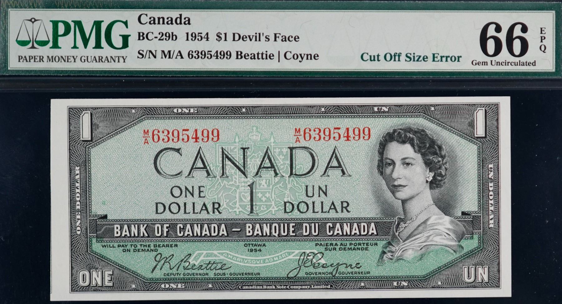 Error Note; 1954 $1 BC-29b #MA6395499, PMG Superb Gem Uncirculated-66EPQ. Cut Off Size Error.