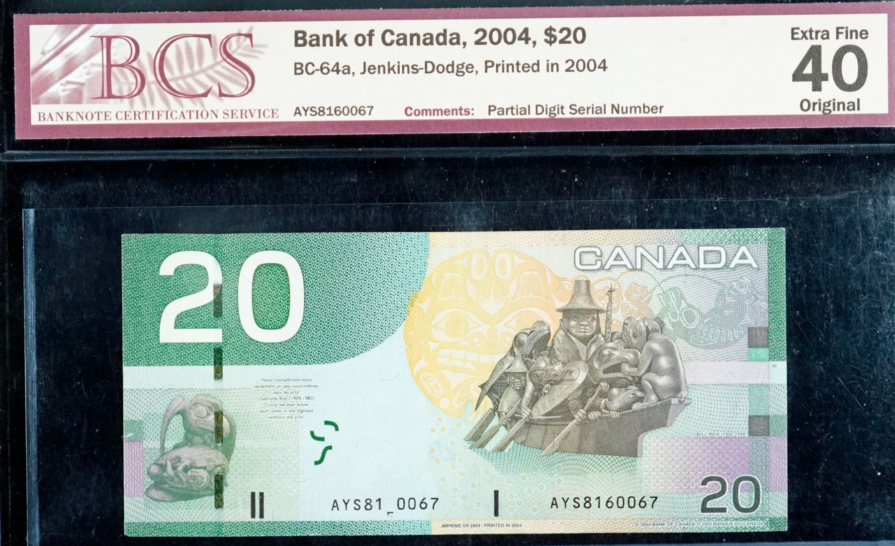 Error Note; 2004 $20 BC-64a #AYS8160067, Partial Digit Serial Number, BCS Extra Fine-40.