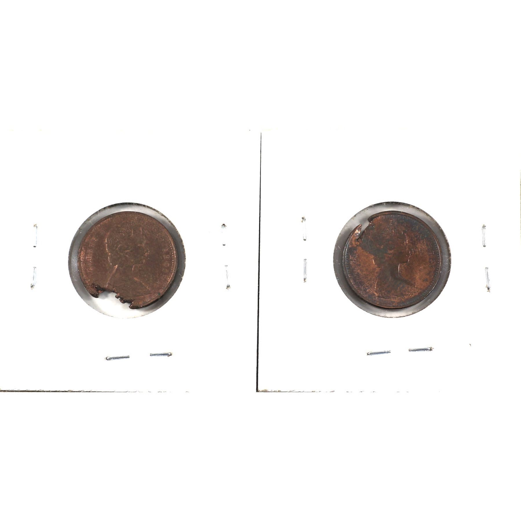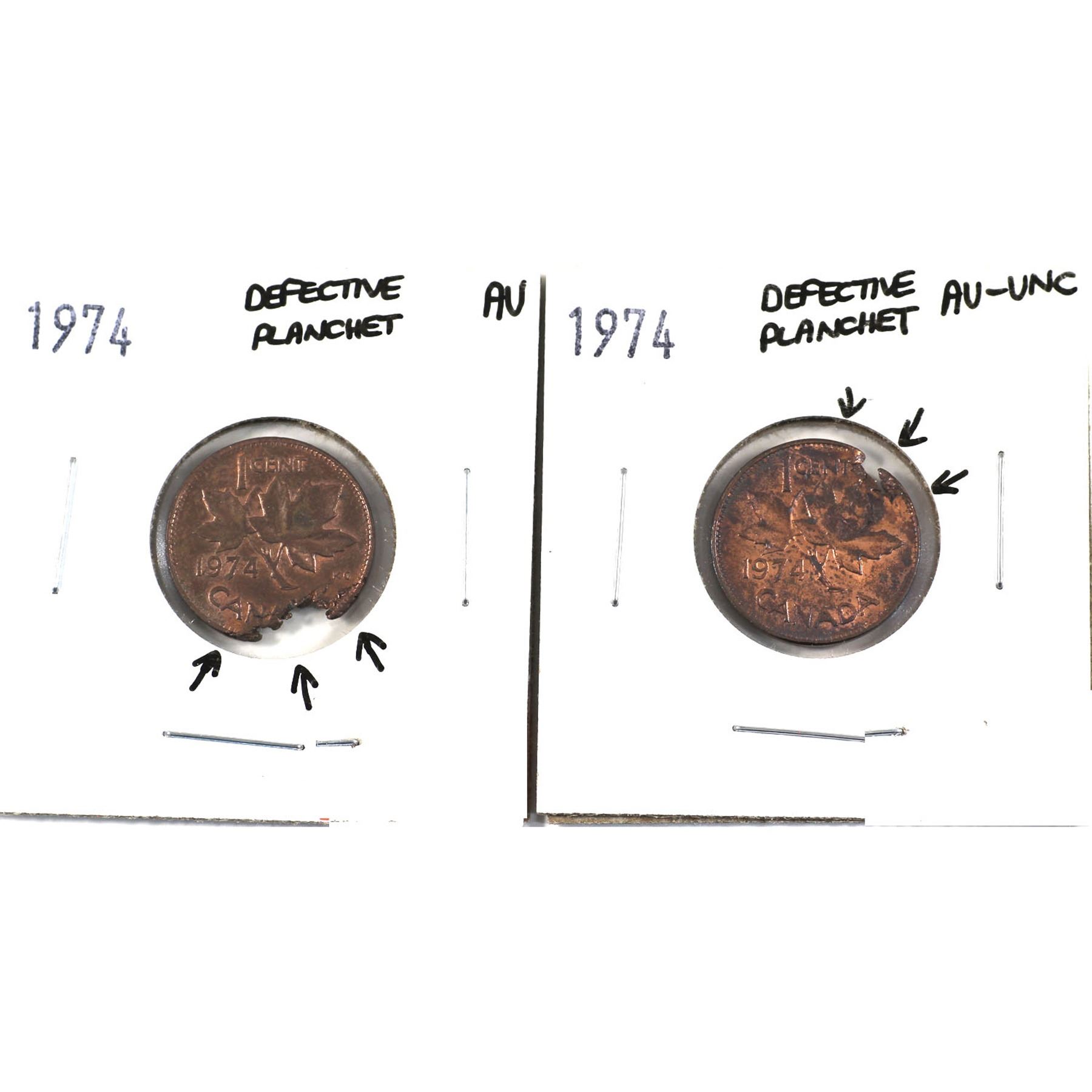 Error Pair of 1974 Canada 1-cent struck on defective planchets. Both coins are in AU condition with chunks of original planchet missing. Impressive errors! (2pcs)