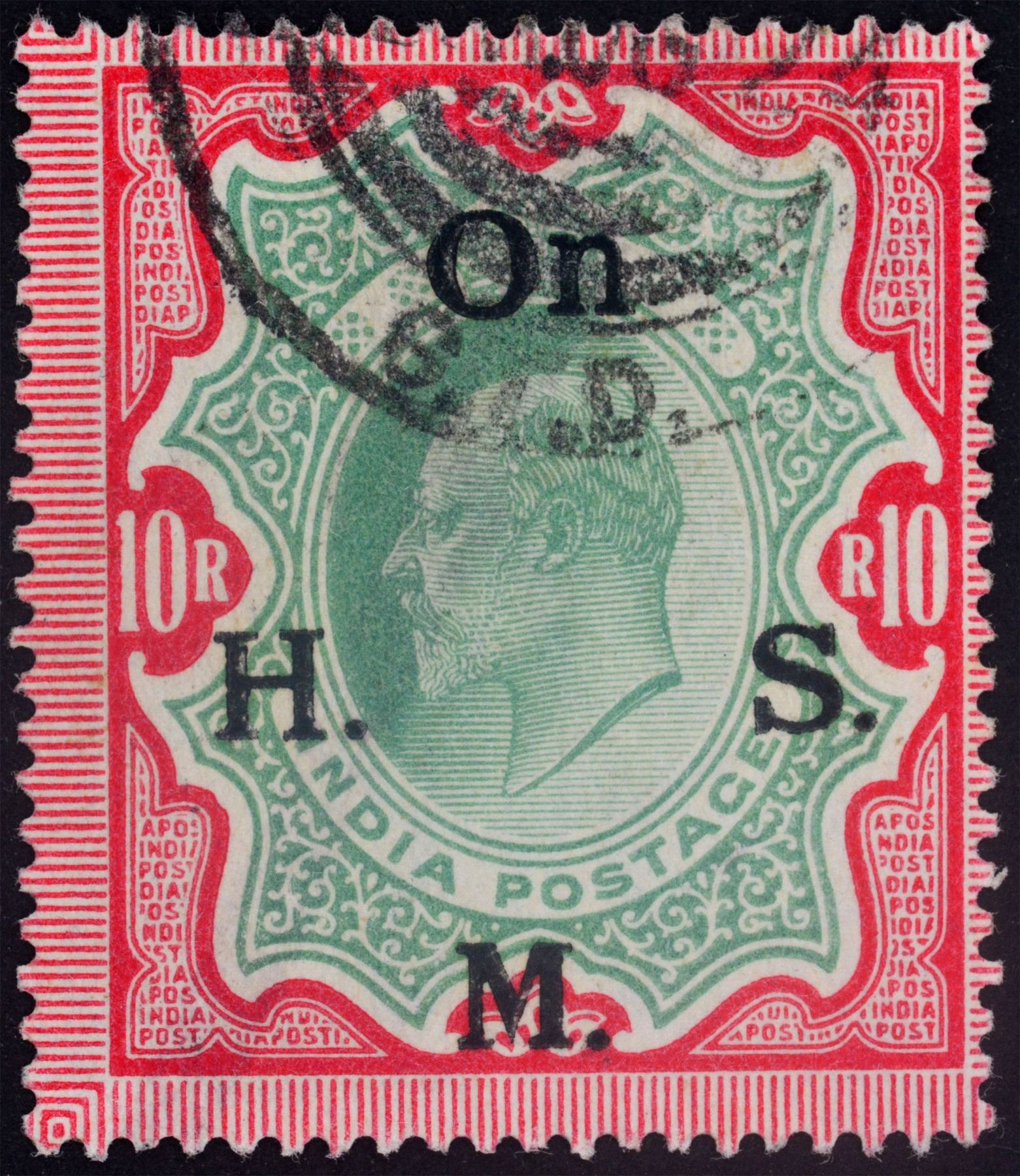Error, British India, King Edward VII, 10Rs, Green & Scarlet, “ON H. M. S.” overprint is incorrectly printed at the bottom, Phila # S77 type, very fine used.