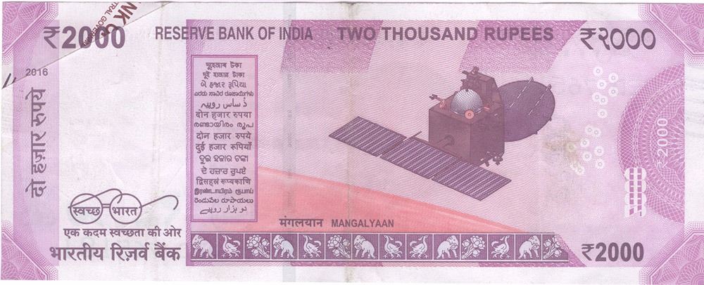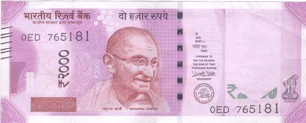 2000 Rupees,Urjit R Patel,2016,S. No. 0ED 765181,R Inset,Error: 30% is not printed and blank at right side on the note leaving the 2000 value in english half printed, reverse left top is printed with the obverse BANK, about very fine and used,Rare.