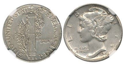 Error; USA 1944 10¢ 10¢ NGC AU53. Curved Clip @ 3:30.