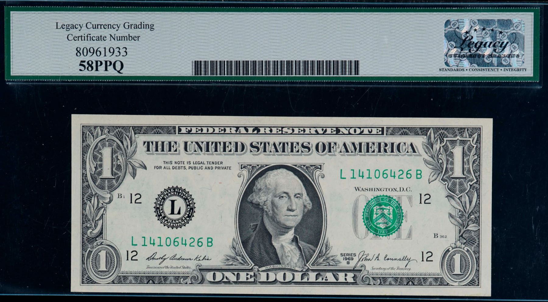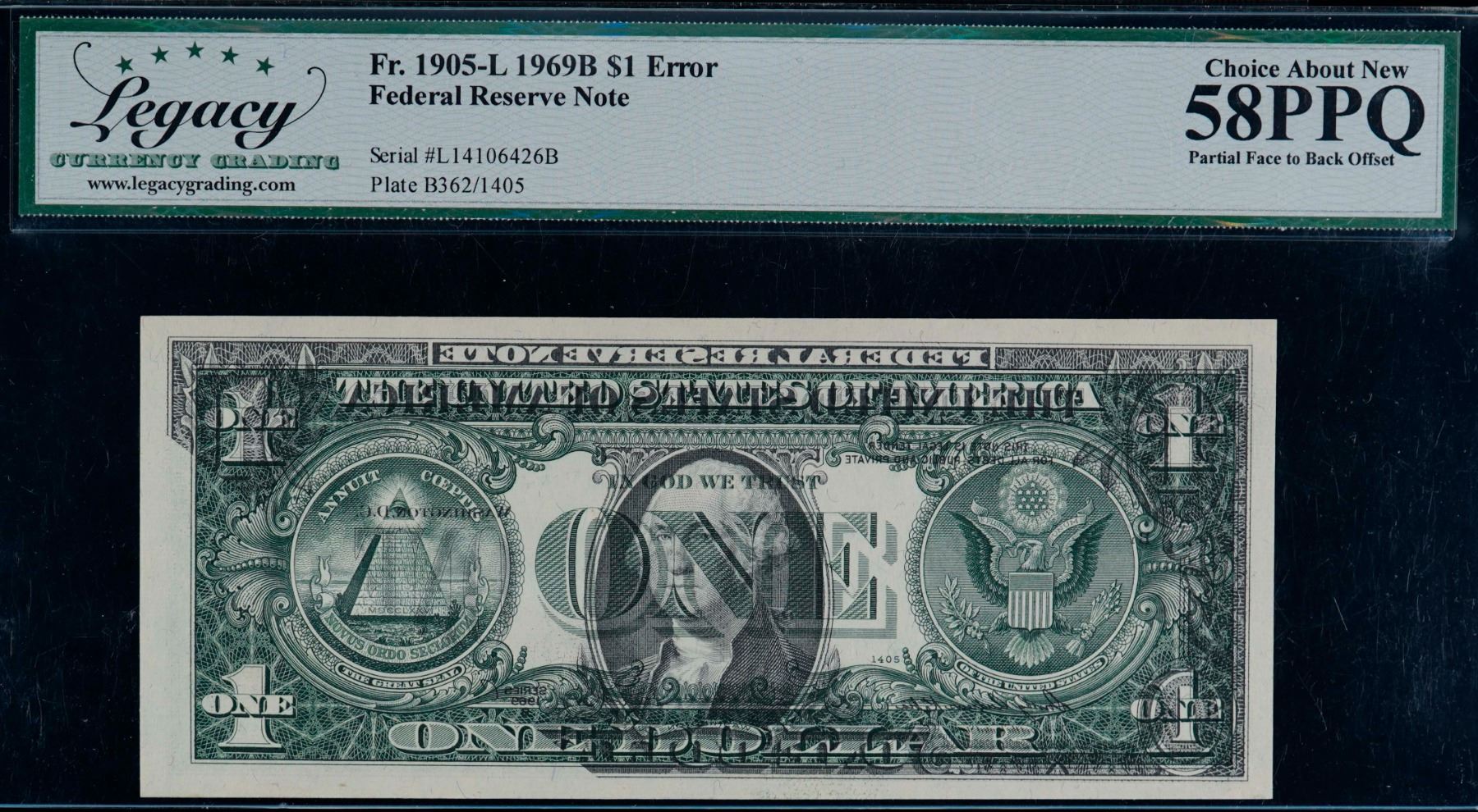Error; USA 1969B $1 #L14106426B Plate B362/1405 Legacy Choice About Uncirculated-58PPQ. Partial Face to Back Offset.