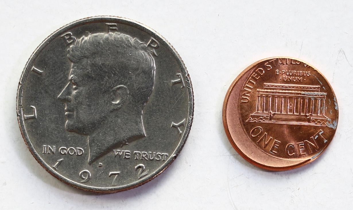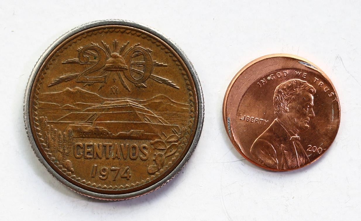 Error; USA 2003 1¢ BU w/Off Centre Strike & 1972 50¢ Fantasy coin showing Obv Encased Mexico 1970 20¢ pc. Lot of 2 pcs,