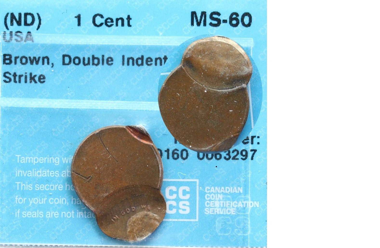 Error; USA (ND) Cent CCCS MS60 BN. Double Indented Second Strike example.